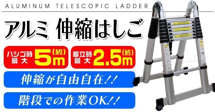 最長5mまで伸びるはしご。 伸縮自在で使用時には1段ずつの引き伸ばし可能! 必要な高さでロックできます。 車のトランクに収納可能。どこにでも運べるコンパクトサイズ! 折りたたんでもたったの17cm!収納スペースにも困らない! さらにアルミ製のパイプとダブルロックの設計で頑丈、安全! 足元の安全性パワーアップし、今まで以上に安心して作業できます! 私生活に不可欠なはしごです! 電球交換やエアコン掃除、2階~3階の外壁、洗車など様々な場面にて活躍! 【商品仕様】 最長:500cm(脚立時:250cm) 収納時:92×68cm 質量:18kg 最大耐荷重:150kg 素材:アルミ(連結部分:スチール) 【注意事項】 ・商品の重量が重く、ケガを防止するためにも、2人以上での作業をされますようお願い致します。 ・ロック状態を確認した上でのご使用をお願い致します。 ・天板部分に乗ってのご使用は危険な為、お止め下さい。 ・足元が不安定な場所などでのご使用はお止め下さい。 ・海外からの輸入製品となりますので、製造、または配送の過程において生じた、細かなキズやへこみが見られる場合がございますが、機能性や品質上に問題はないため、返品や交換の対象とはなりません。予めご了承の上、ご購入をお願いいたします。 ・商品を使用して発生した事故・トラブル・破損等につきましては一切の責任を負いかねます。 ・商品は、モニターによって色合いが異なって見える場合があります。 ・仕様・デザインは改良のため予告なく変更することがあります。 |