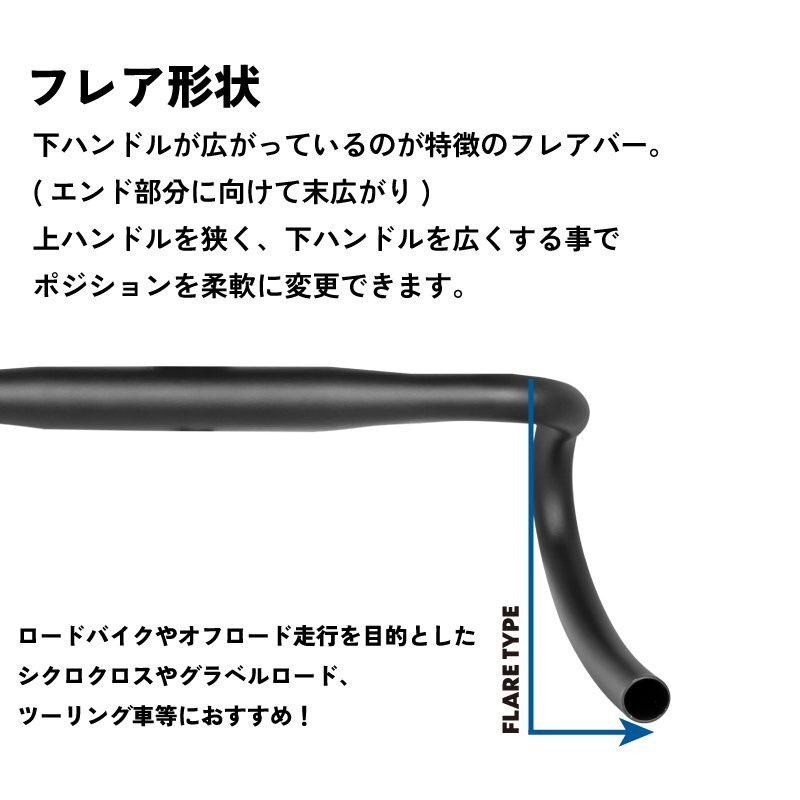 下ハンドルが広がっているのが特徴のフレアハンドル。 ショートリーチでブラケットが握りやすいタイプ。 エンド部分に向けて末広がり。 ロードバイクの他にもオフロード走行を目的としたシクロクロスやグラベルロード、ツーリング車等におすすめ。 [フレア形状] 下ハンドルが広がっているのが特徴のフレアバー。 (エンド部分に向けて末広がり) 上ハンドルを狭く、下ハンドルを広くする事でポジションを柔軟に変更できます。 [ショートリーチ] ショートリーチでブラケットが握りやすい。 手の小さい方やブラケットを近くした方にもおすすめです。 [耐久性] 軽量で丈夫なアルミ材質 [センターライン] ハンドル交換の際に調整しやすいセンターラインとメモリ 商品内容ドロップハンドル 幅380mm クランプ径31.8mm 重量294g ※400mm ドロップ130mm リーチ86mm 材質アルミ タイプ末広がり(フレアタイプ) |