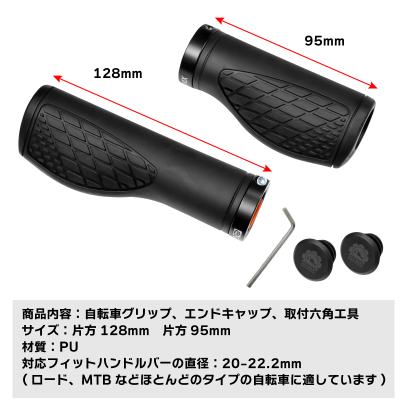 短めの自転車ショートグリップをお探しの方へ。 ロングサイズとショートサイズの組み合わせです。 ハンドル周りのシフト等で左右のハンドル露出サイズが異なる方に最適。 エルゴデザインで握りやすく疲れにくいグリップ。 手首の疲れや、腱鞘炎で悩んでいる方におすすめです。 掌の広さから親指まで心地よく握られ、体の重みが手の平にうまく分散し、痛みと疲れを大幅低減。 前傾姿勢も楽にキープできます。 クロスバイクやマウンテンバイク・ミニベロ・電動自転車などフラットハンドルの自転車に最適。 取付け工具付属ですぐに装着作業ができます。 [長さが違う組み合わせ] 左右の長さは異なるのでハンドル露出が異なる方に最適です。 ロング128mmとショート95mmの組み合わせです。 [エルゴデザイン] 手のひらをベタっと乗せて力を分散しとても楽に! 長時間の乗車も快適に。 [衝撃吸収] 程よい柔らかさで路面からの衝撃を吸収し体への負担を軽減。 グリップ表面に滑り止め加工を施しグリップ力を向上させます。 [装着しやすい] 内側の芯がグリップ装着時に通常のゴムタイプより滑りやすく 着脱作業がしやすい。 [しっかり固定] ネジで固定のロックオンタイプ。 ズレたりしないでしっかりと固定します。 [汚れや傷みに強い] 耐久性が高く、高強度で耐摩耗性に優れています。 商品内容グリップ、取付け工具、エンドキャップ 長さ片方ロング128mm/片方ショート95mm 材質PU フィットハンドルバーの直径20-22.2mm (ロード、MTBなどなどほとんどのタイプの自転車に適しています) カラーブラック 《ご注意》 ・きつく締め過ぎないことをお勧めします。 ・商品は入荷によりキズがある場合があります。 その場合は保証対象外になりますのでご了承お願い致します。 ・ディスプレイ環境により実物と色が異なる場合が有ります。 ・入荷時期により予告無く一部仕様変更する場合が有ります。 ・本製品は単純構造につき日本語説明書が付属しません。 |
