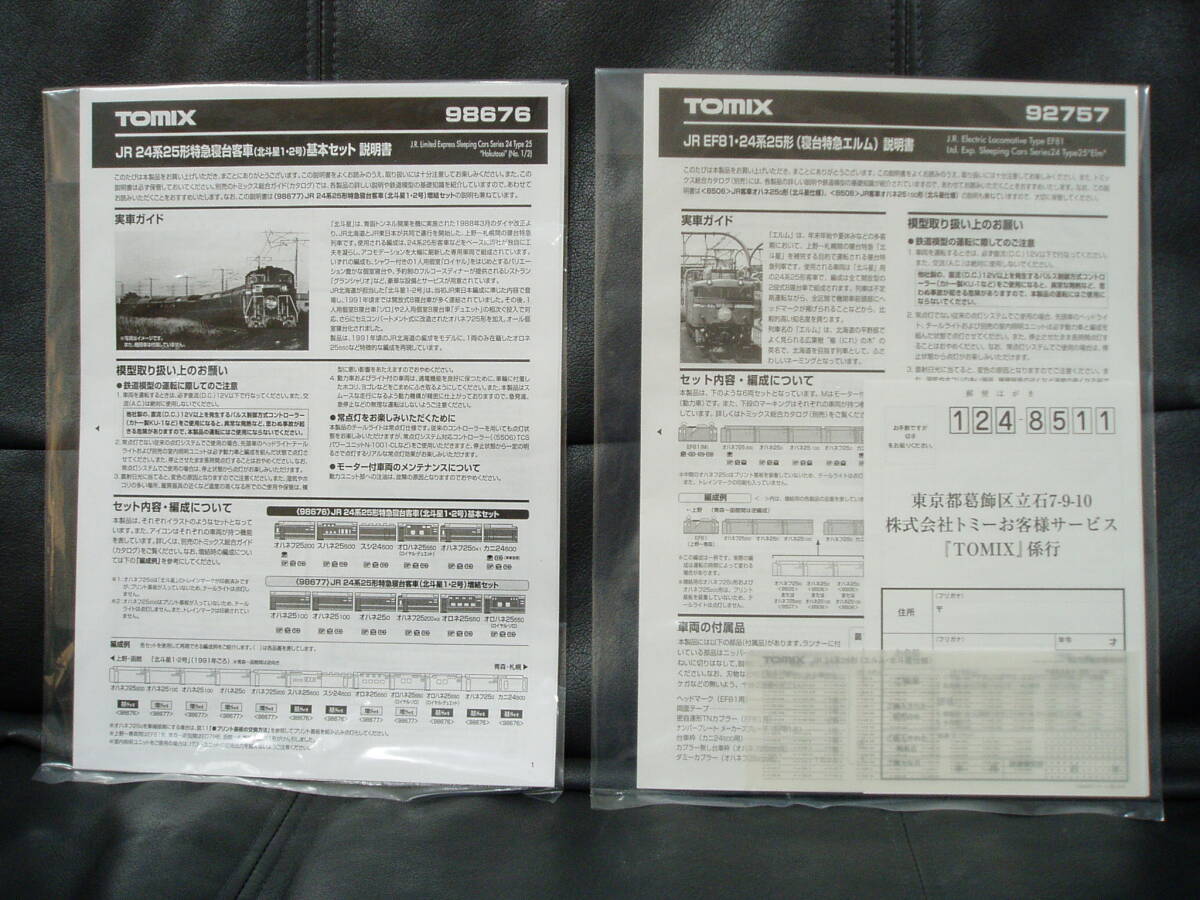 説明書は92757セットの物のほか、「トミックス/TOMIX 98676 JR24系25形 特急寝台客車(北斗星1・2号)基本セット」のコピーが付属します(写真9枚目参照)。また写真はありませんが、カニ24用の機関車連結側(テールライトが点灯する側)用のTNカプラー JC6376 が1個付属します。最新の製品には付属する「カニ24用ステップパーツ」はありません。