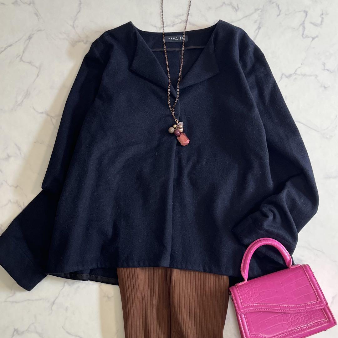 ウール素材なのでカットソーやブラウスをインしてのコーデがおすすめ。