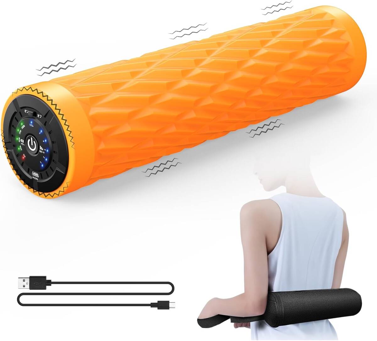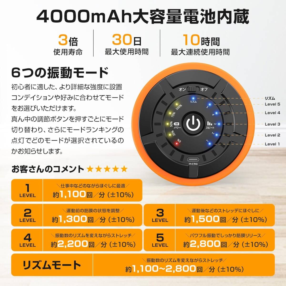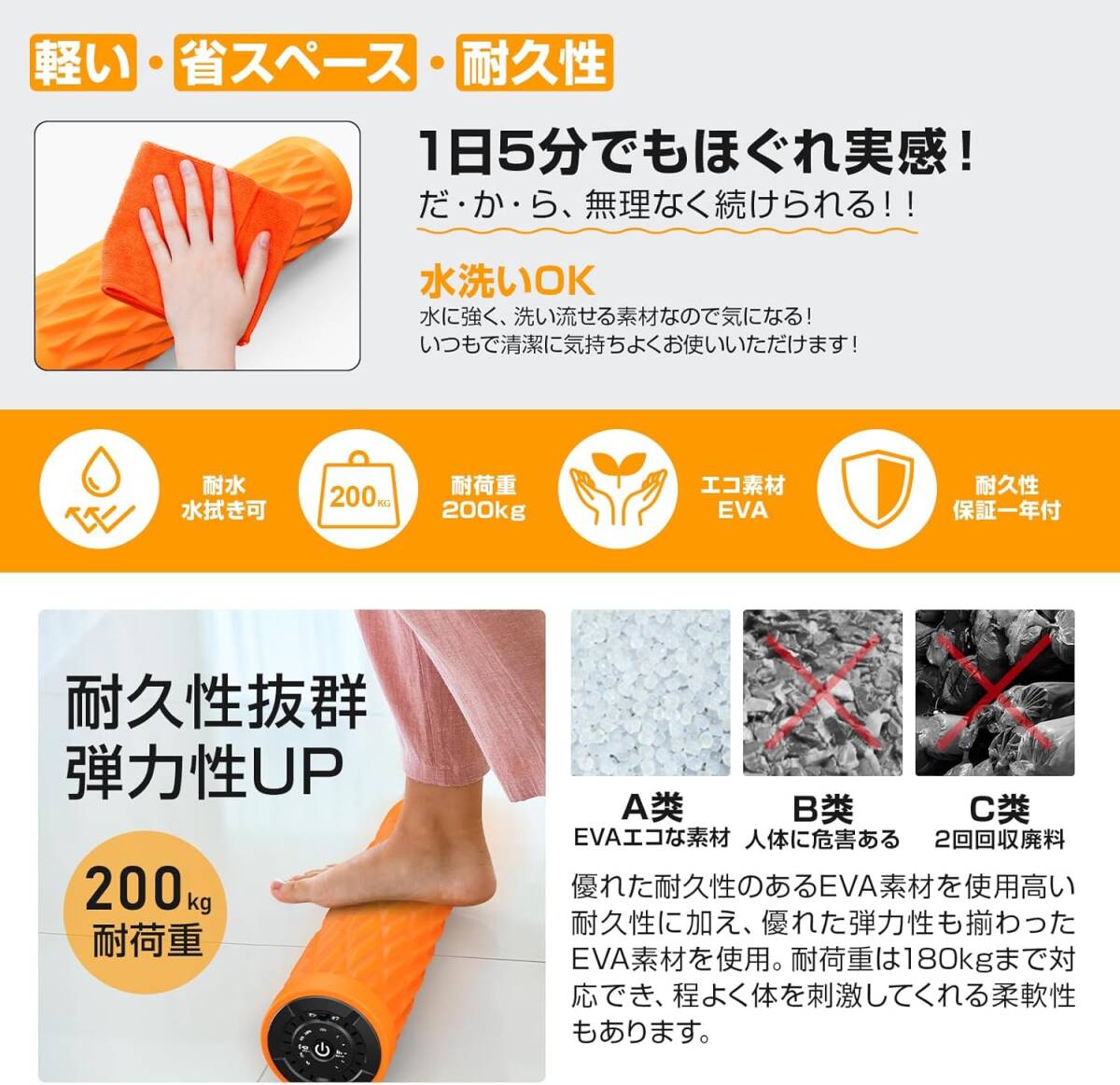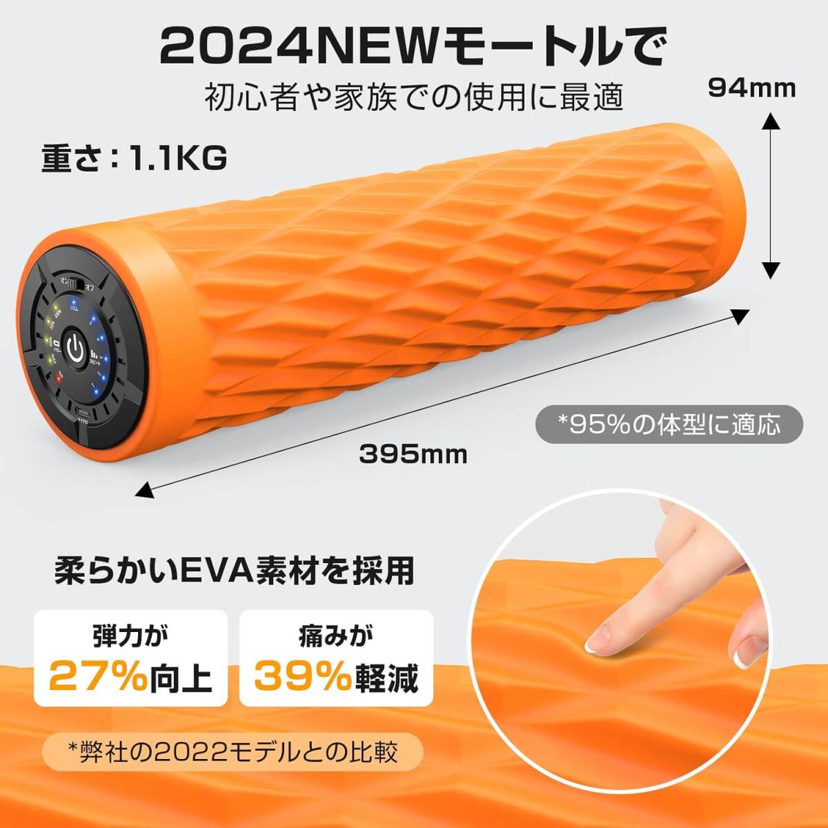 スリムオレンジ色 フォームローラー 電動 筋膜リリース ローラー 4000mAh 大容量電池 多種類の凹凸 パワフル振動
