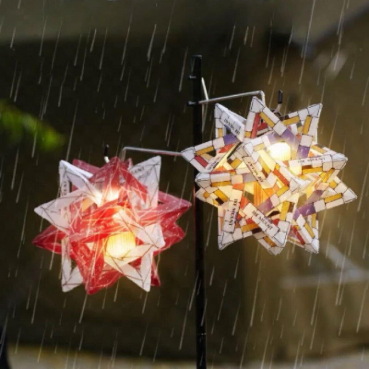 星型の立体構造とカラフルなモザイク柄が目を引く、ステンドグラス風ランタンシェードです。