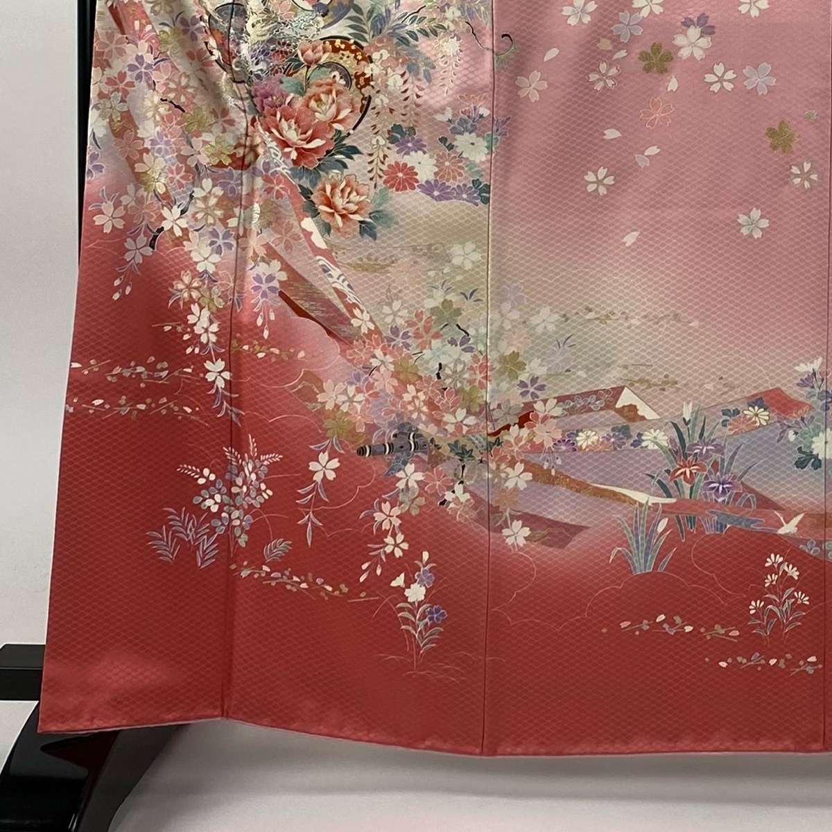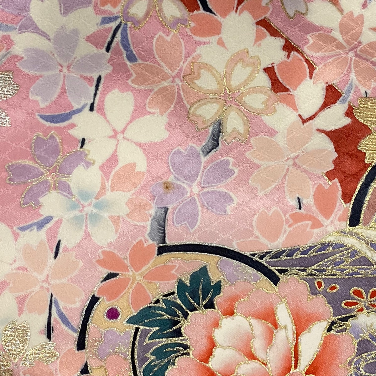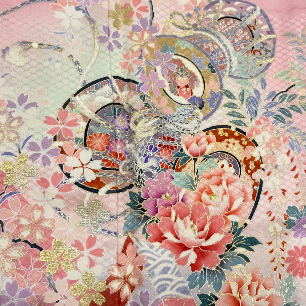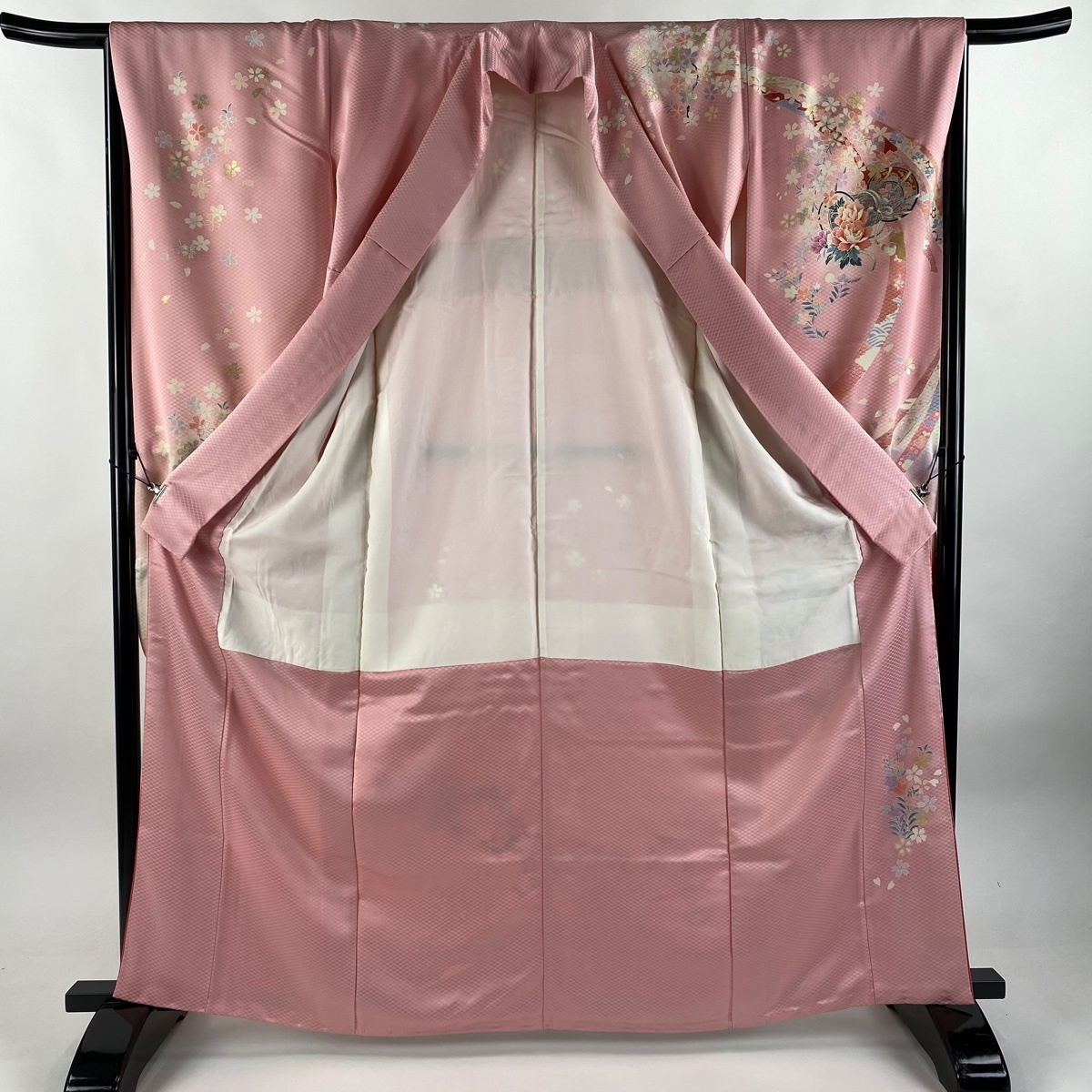 | 振袖 秀品 鼓 草花 金銀彩 ぼかし ピンク 袷 身丈165 裄丈65.5 M 正絹 【中古】 |