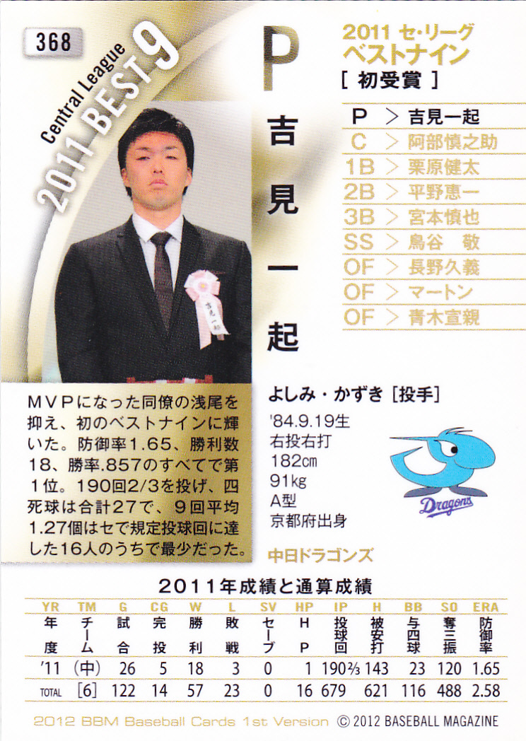 2012BBMベースボールカード1st 368 吉見一起 中日ドラゴンズ 京都府 ベストナイン