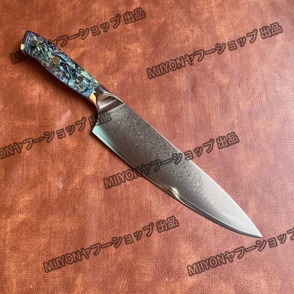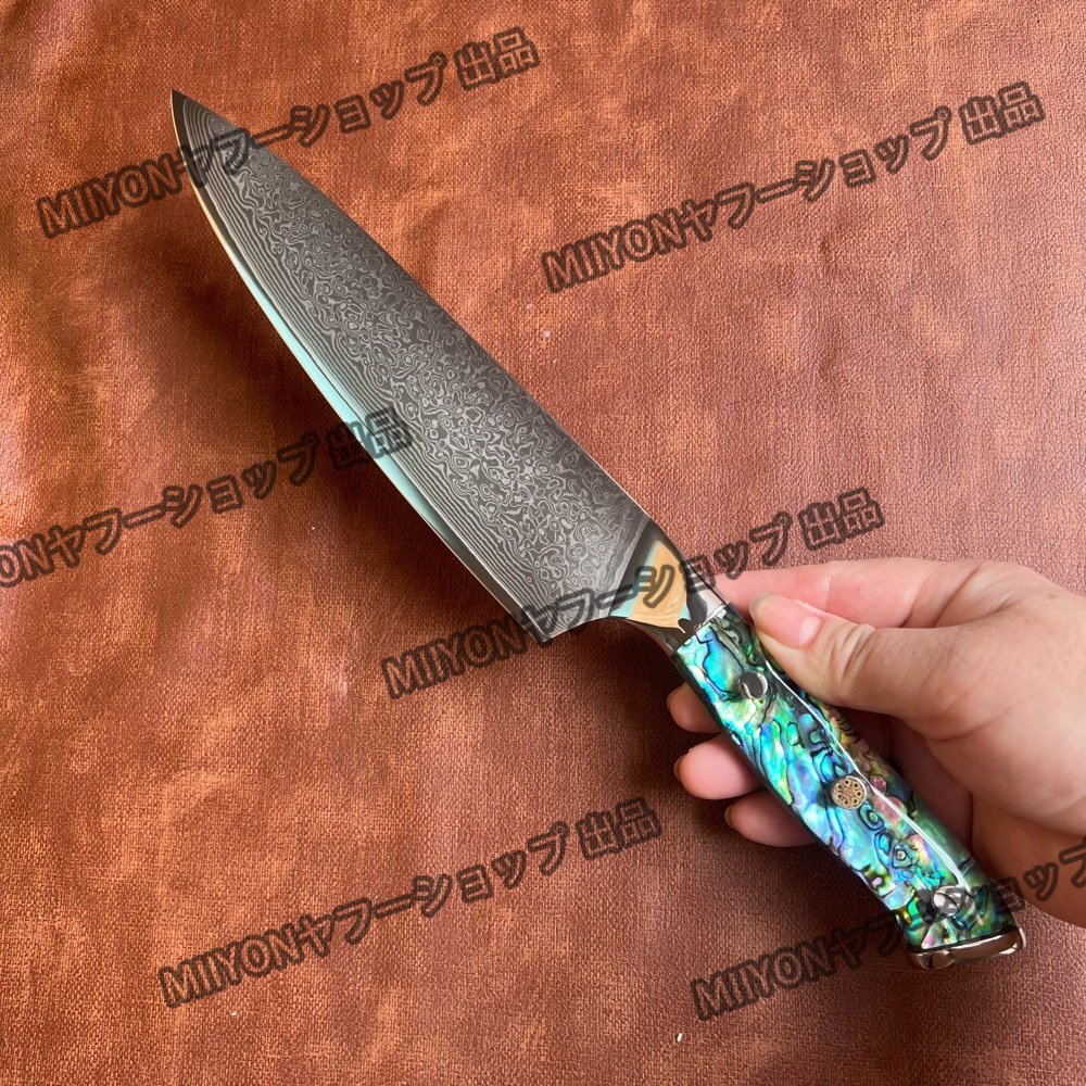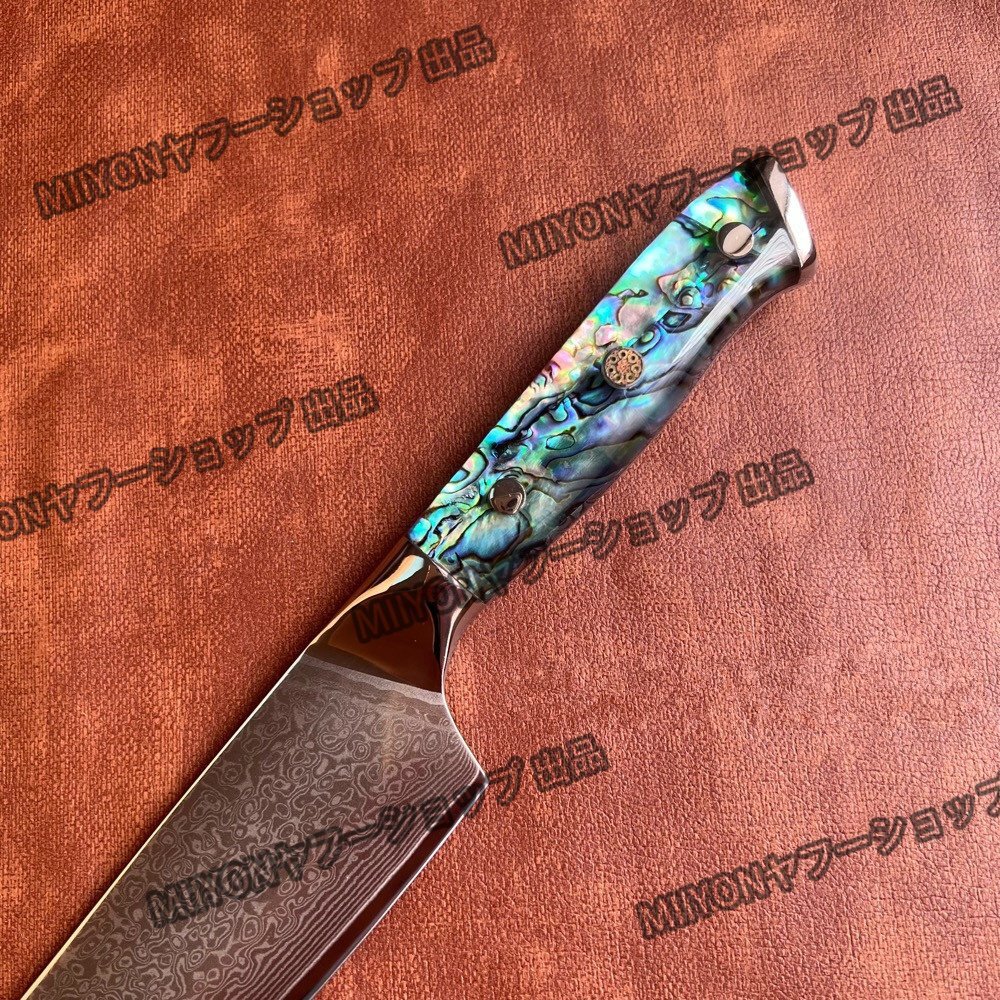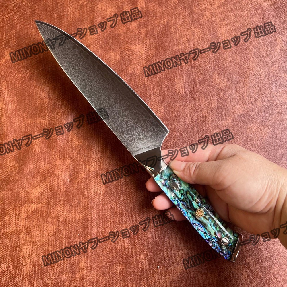 刺身包丁 鏡面仕上げ VG10号本焼出刃包丁 鮑貝のハンドル 寿司包丁 魚包丁 刃渡り345mm 67層のVG10ダマスカス鋼 lhw043