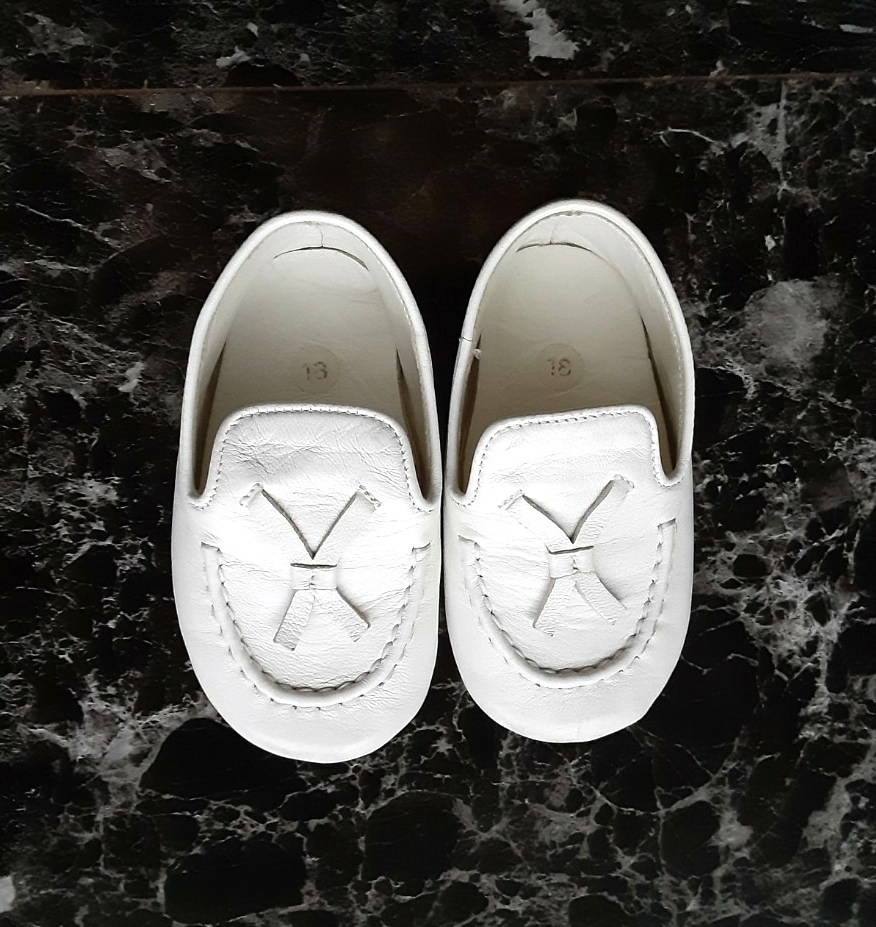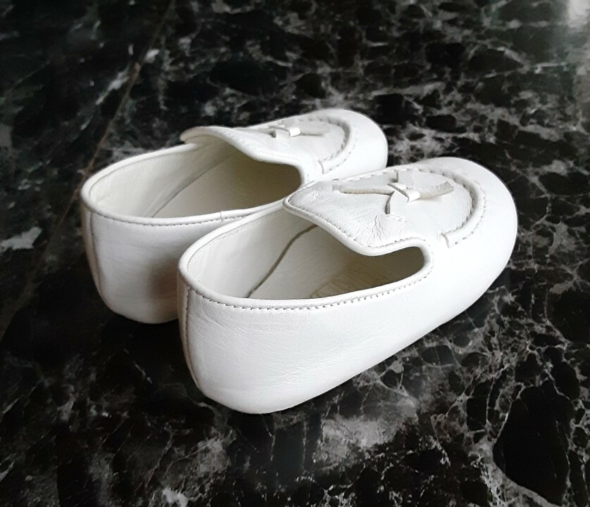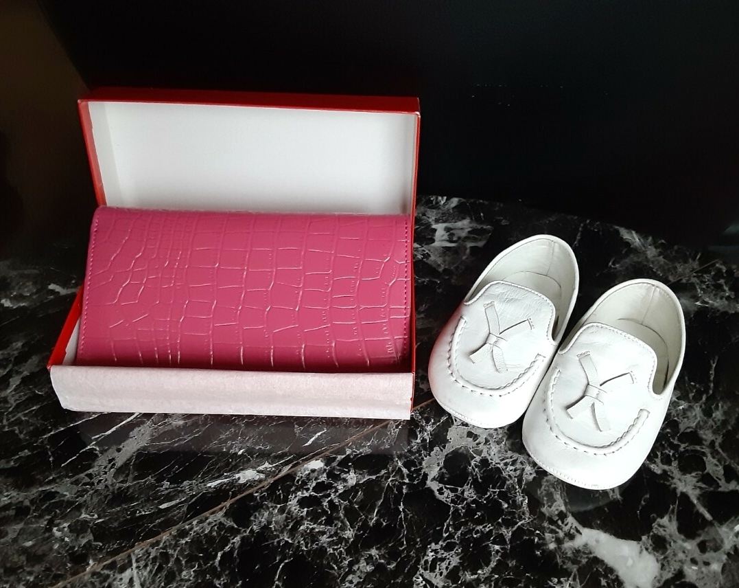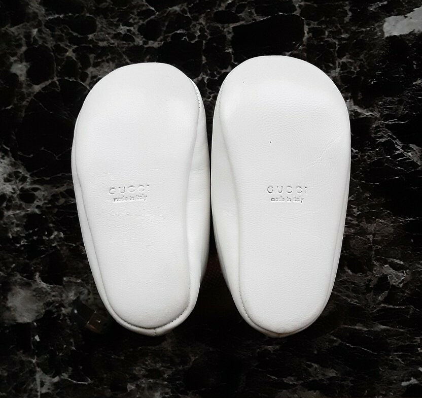 GUCCI グッチのベビーシューズ (レザー・白・11cm) と 宝石専門店 Ambrose のカード入れ(ピンク・非売品) です。