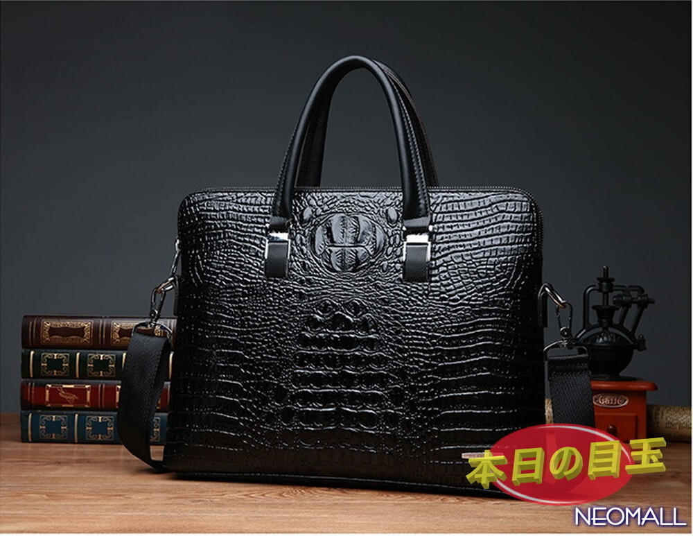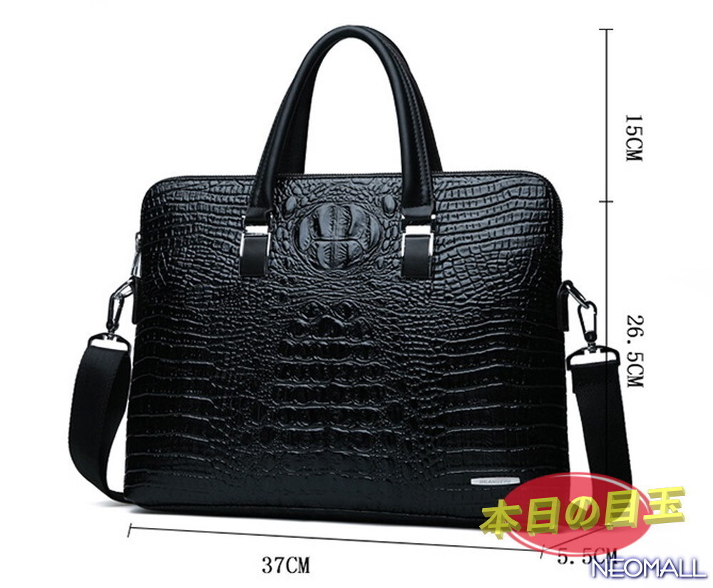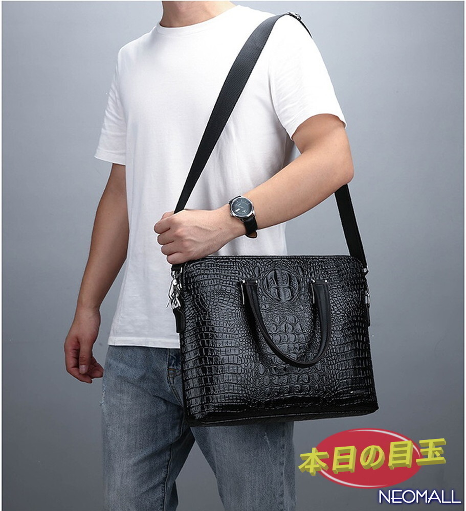 1円~ 新品 メンズ 高級PUレザー ビジネスバッグ【596】ブラック ブリーフケース ショルダー スクエア 横型 大人気 質感◎ワニ柄 型押し