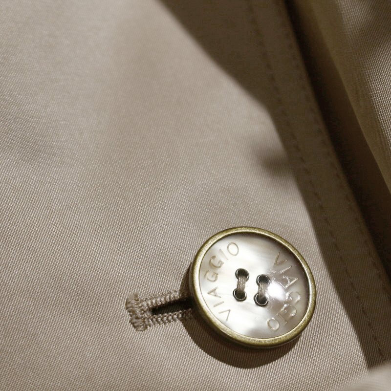 定番のトレンチデザイン、取り外し可能な中綿ライナー付き、アンティークゴールドの縁がお洒落なロゴボタン、ラインが綺麗な1枚です。