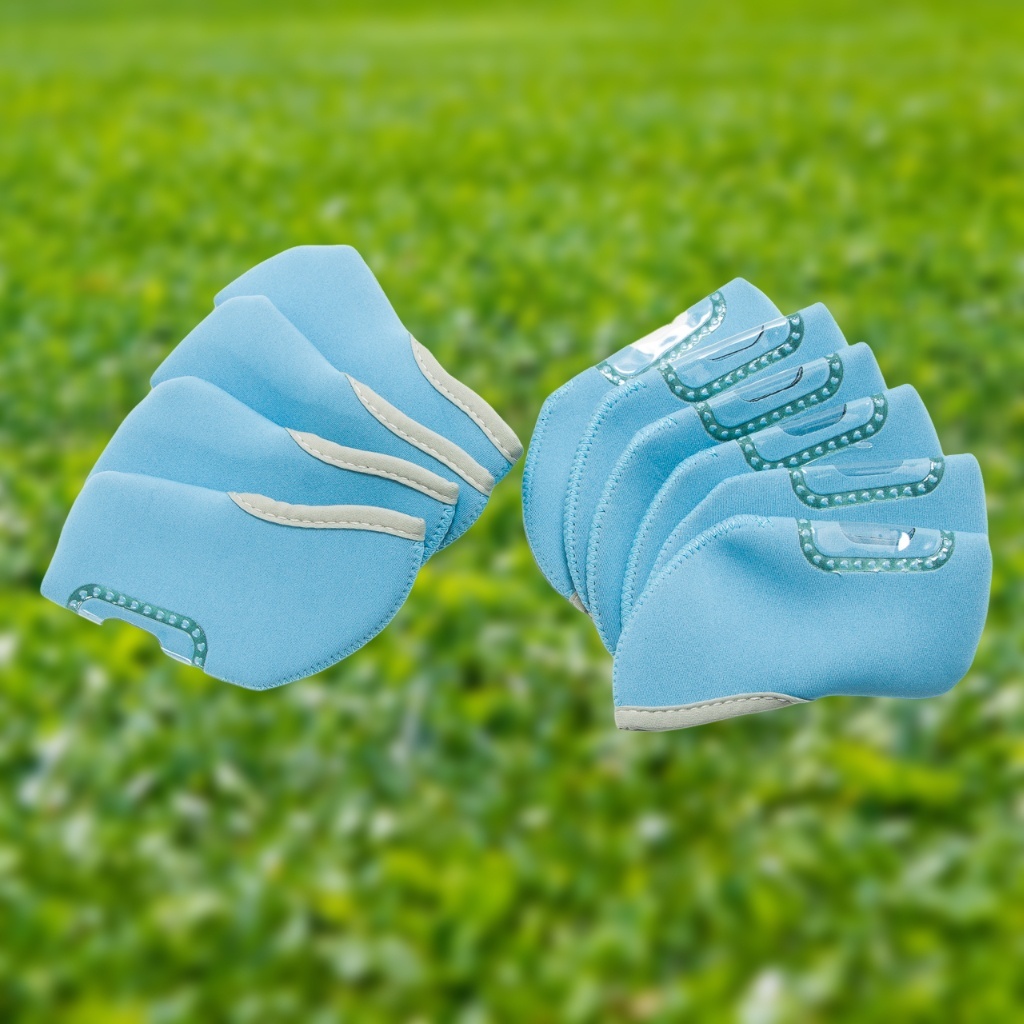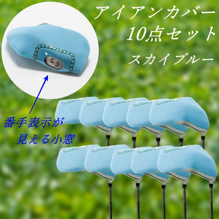 アイアンヘッドカバー10点セット スカイブルー ゴルフ用品 番手数字が見易い窓付 ネオプレーン 新品 未使用品