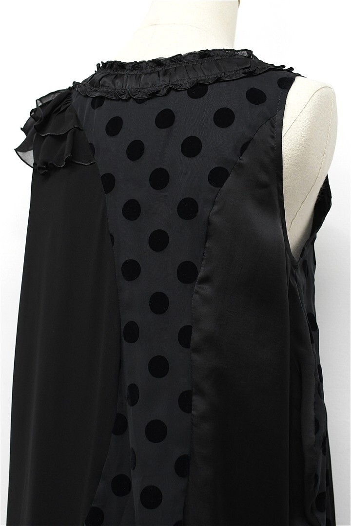 V285/美品 gomme ゴム アシンメトリー ノースリーブワンピース ドレス 変形 ひざ丈 フレア 生地切替 フリル ドット M 黒 ゴシック ゴス