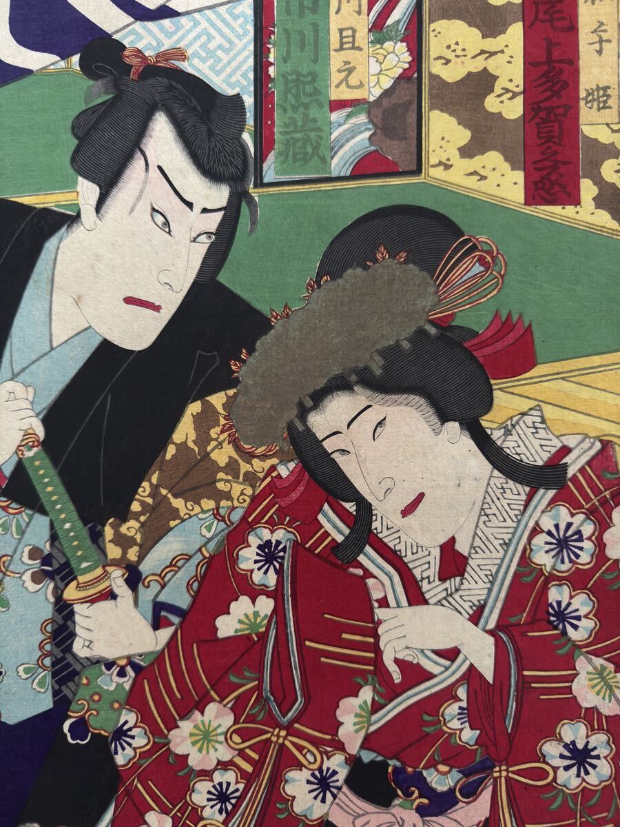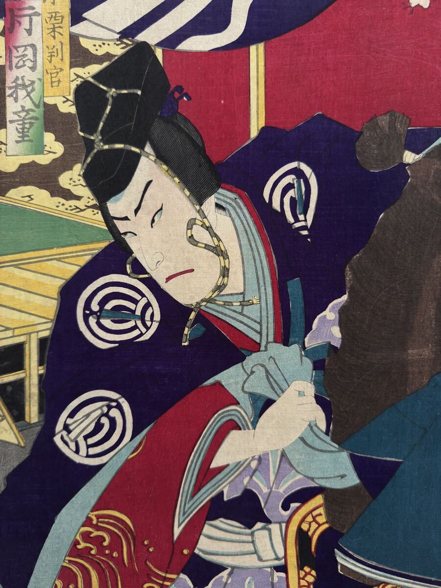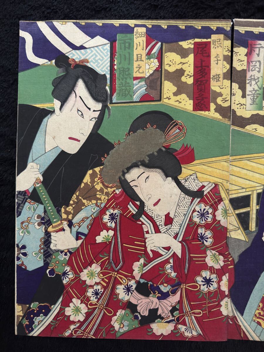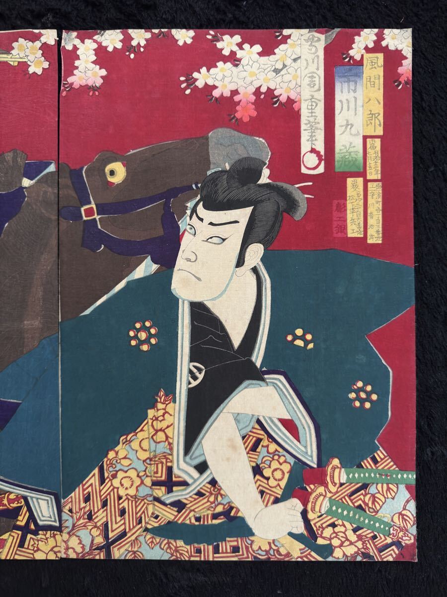 明治期/真作 守川周重「小栗判官 片岡我童」本物浮世絵木版画 役者絵 歌舞伎絵 芝居絵 錦絵 大判 三枚続き 保存良い