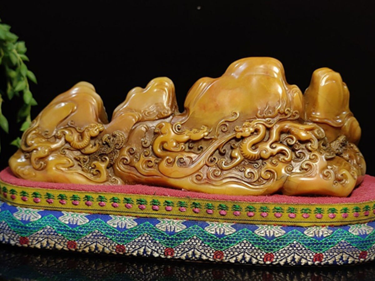 「清 徐三庚 老寿山石 田黄石彫り 瑞獣送寶 山子印章」極細工 擺件 古賞物 中国古美術 旧蔵出