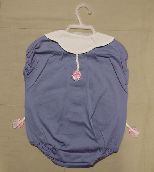 白い襟が付いた紫のロンパースです。