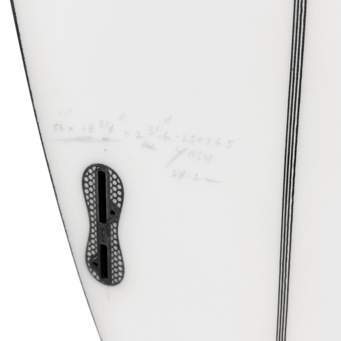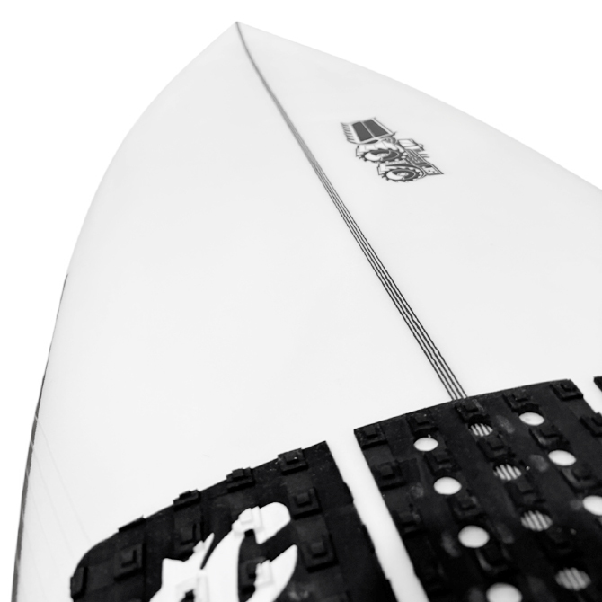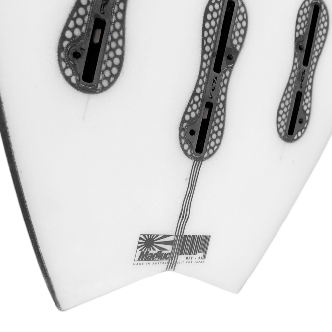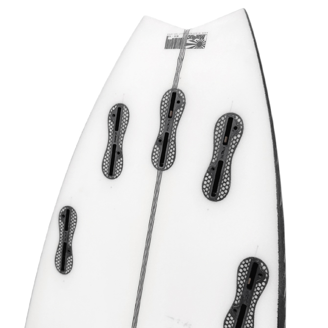 全体的にローからフラットなロッカーに、ノーズから施されるシングルコンケーブを特徴とし、フィンの前方でダブルコンケーブに変化しています。この設計はボードフローを最大限に発揮し、最速のスピード性を実現し機動性を維持する事が可能です。また 5フィンを標準装備し条件に応じてクワッド/スラスタ-とコンディションによって使用可能です。