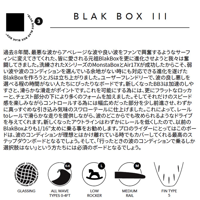 ここ数年 洗練されたXシリーズの“Monsta Box”と“Air 17X”が成功したことで、JSは、“BlakBox”のリ.デザインを行い、バットでプアーなコンディションでも毎日海に入るサーファーが使用するニューボードを最大限に考える必要がありました。