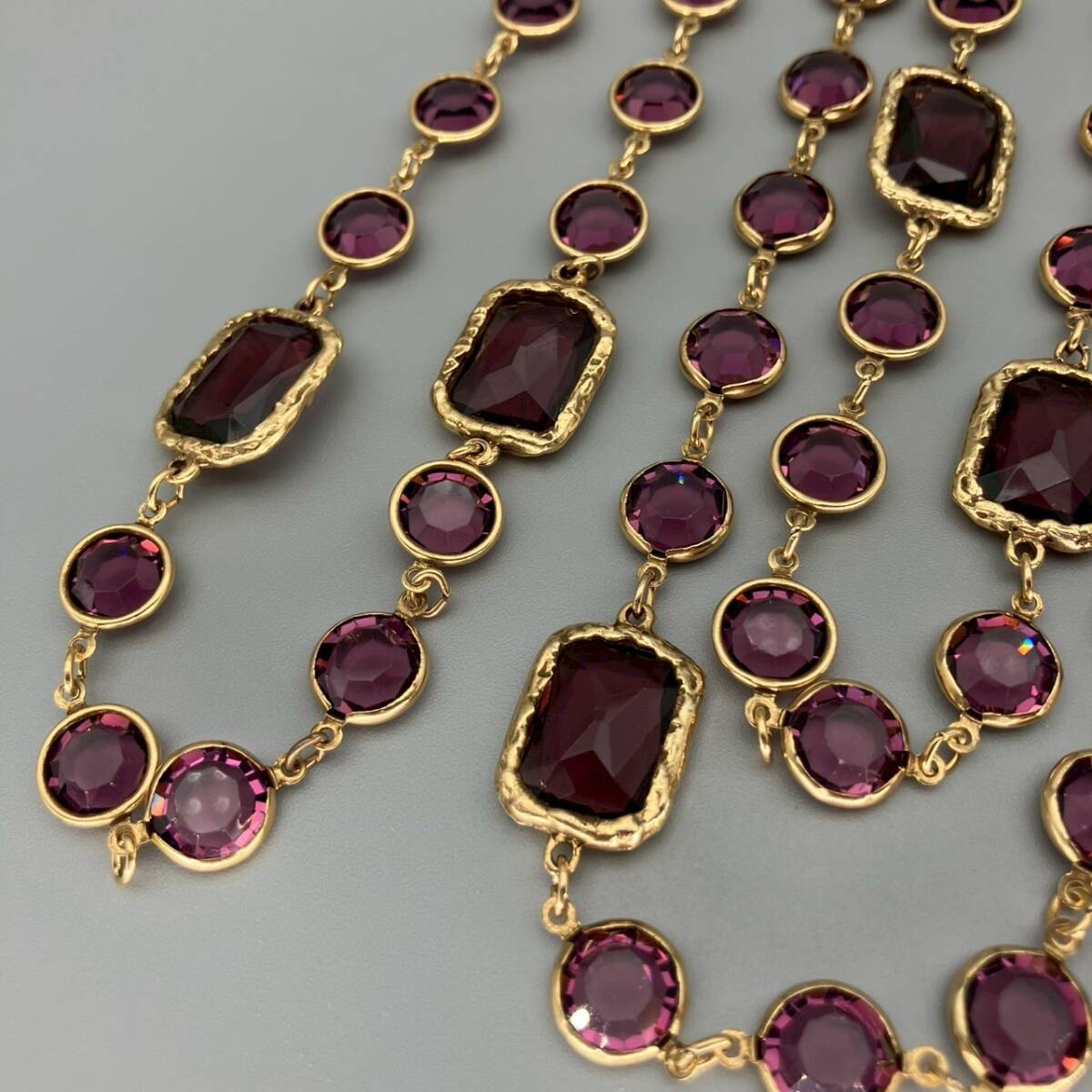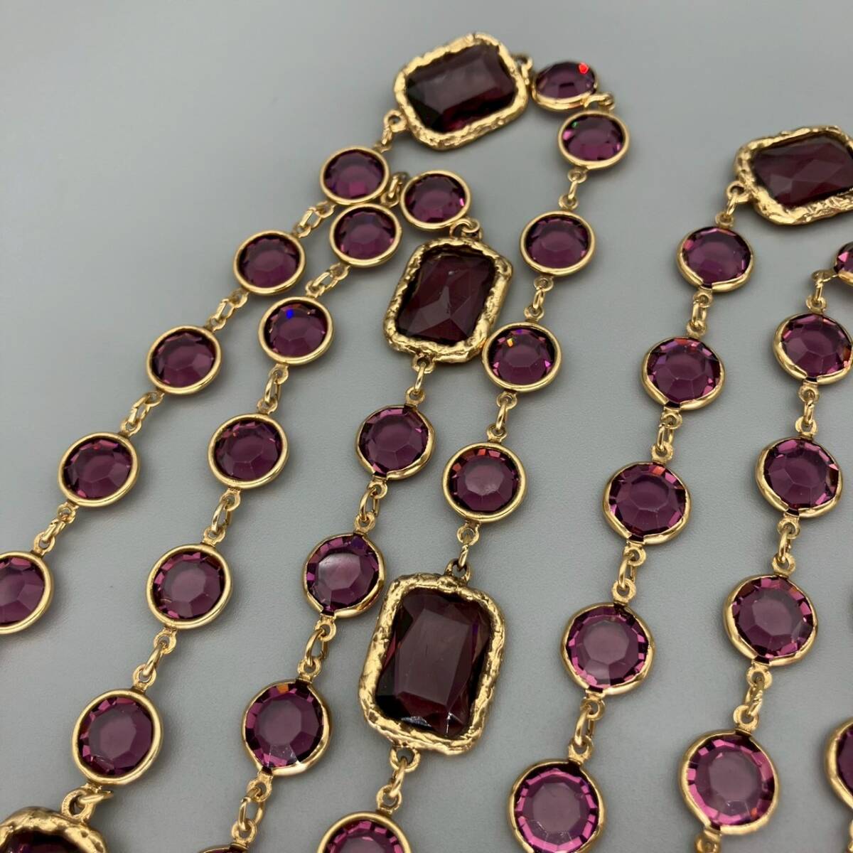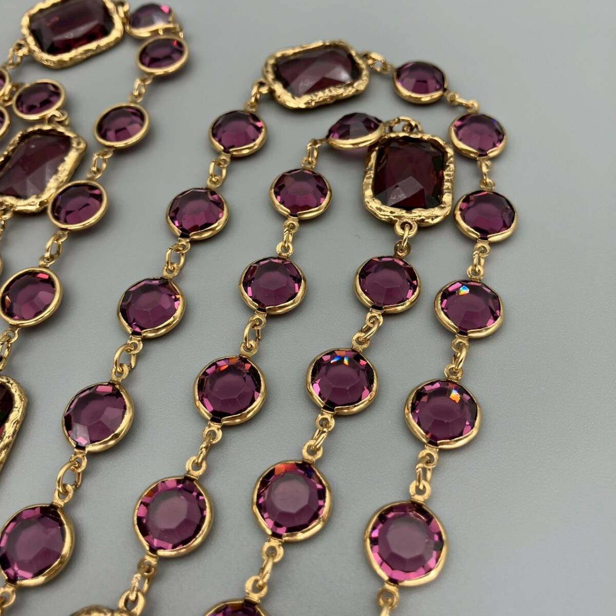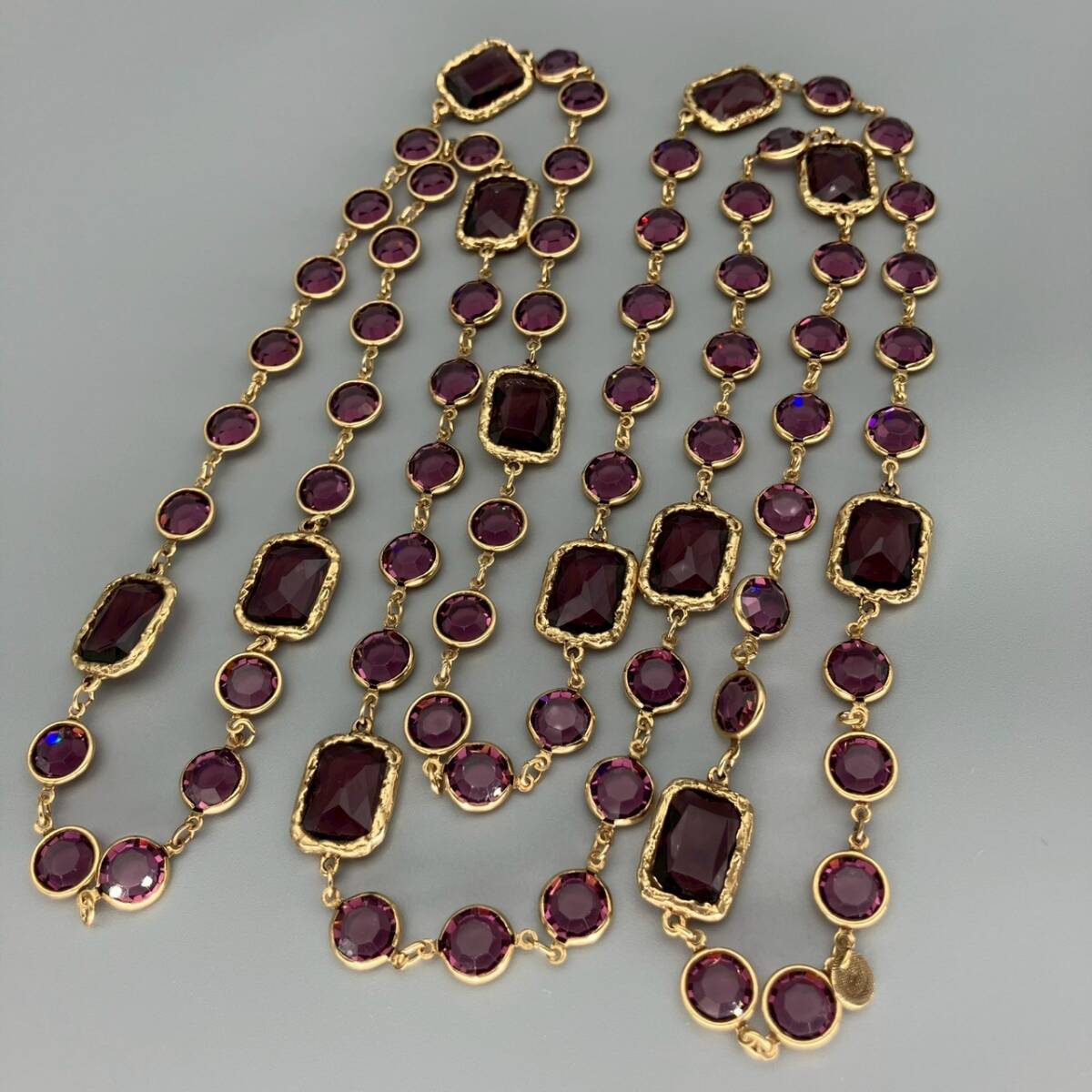 【ブランド】 CHANEL (シャネル) 【カラー】 ゴールド/パープル系 【チェーンサイズ】 全長:約166cm 【状態】 ラインストーンにスレ傷あり。 刻印あり。 【付属品】 なし | |