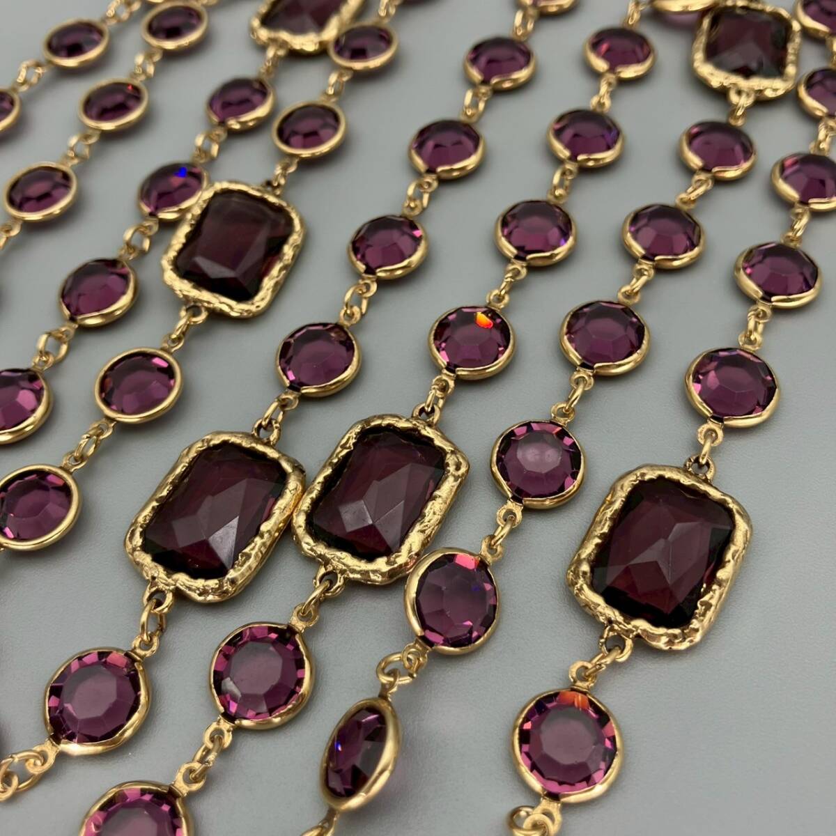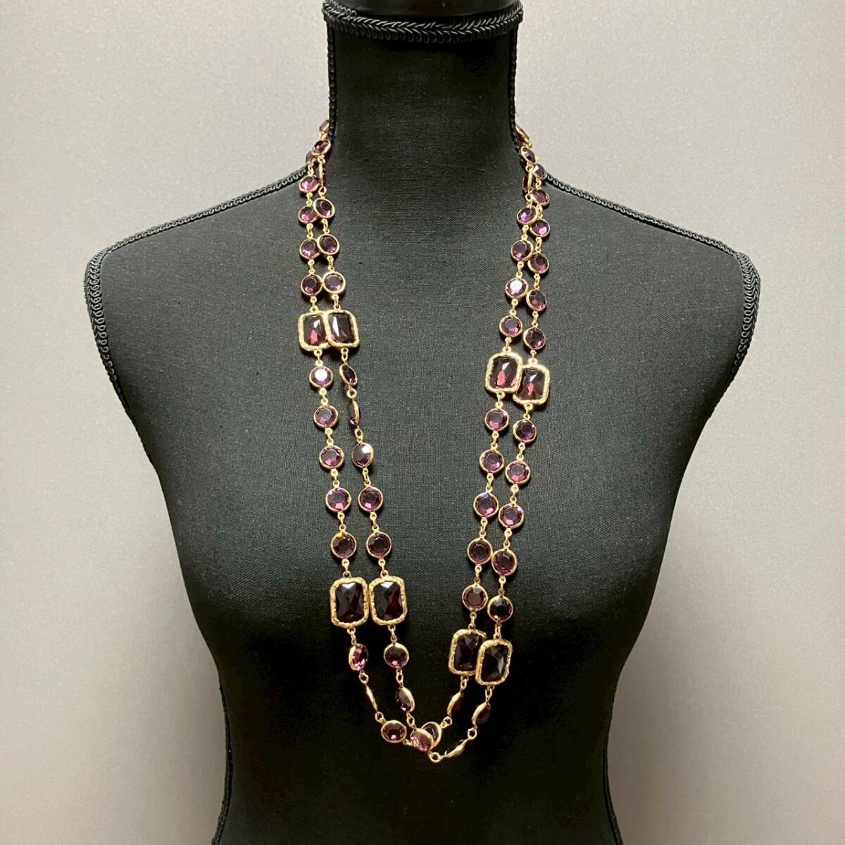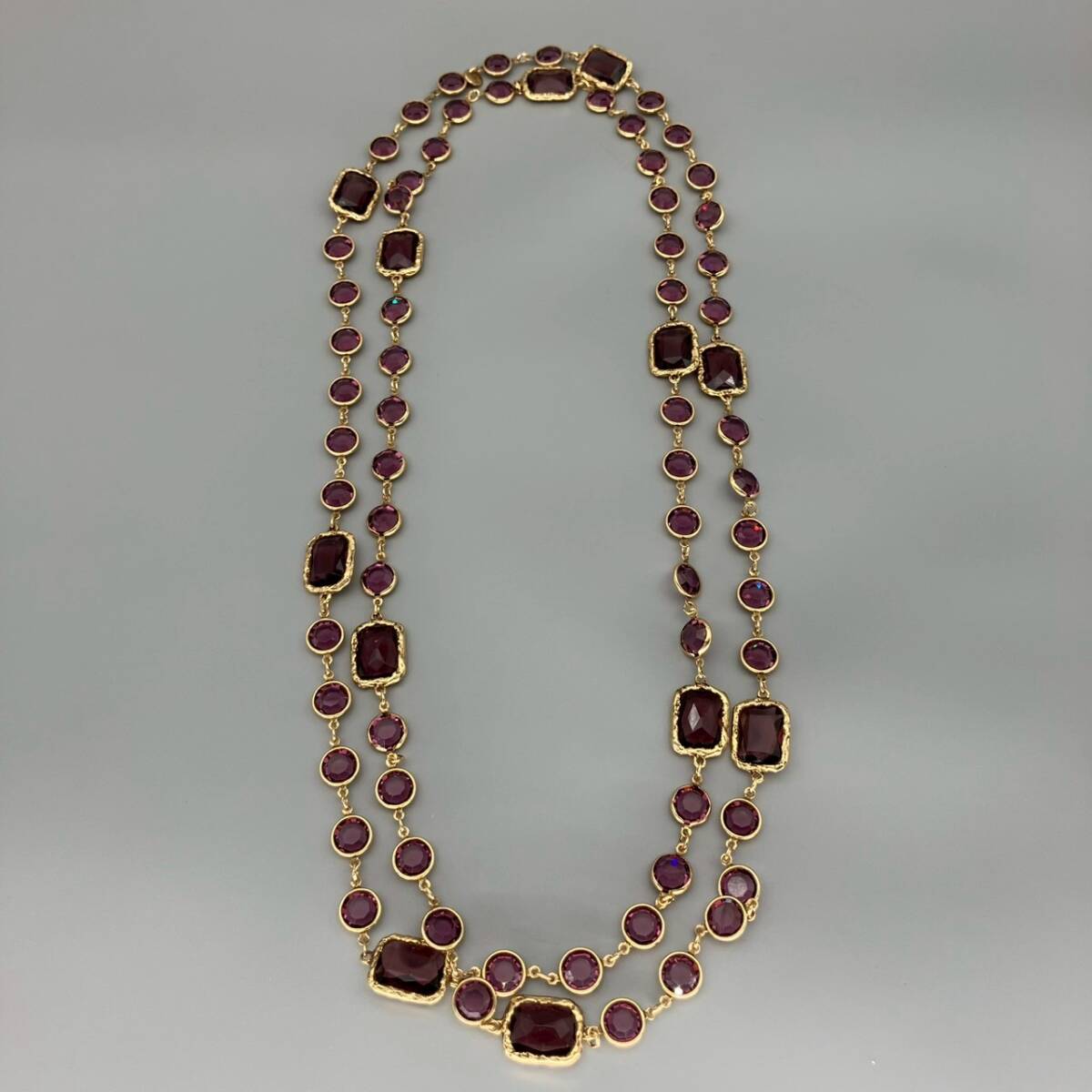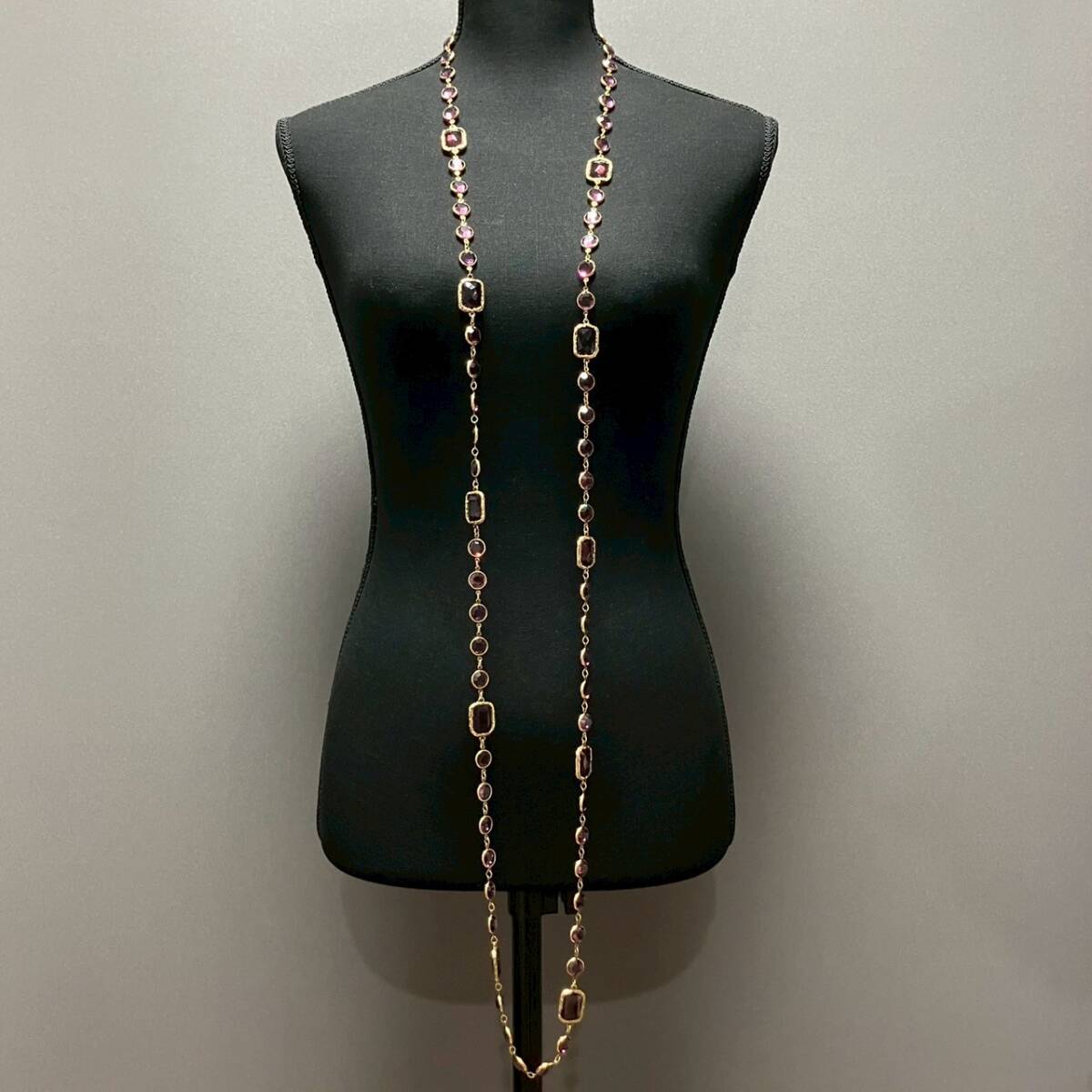 【ブランド】 CHANEL (シャネル) 【カラー】 ゴールド/パープル系 【チェーンサイズ】 全長:約166cm 【状態】 ラインストーンにスレ傷あり。 刻印あり。 【付属品】 なし | |