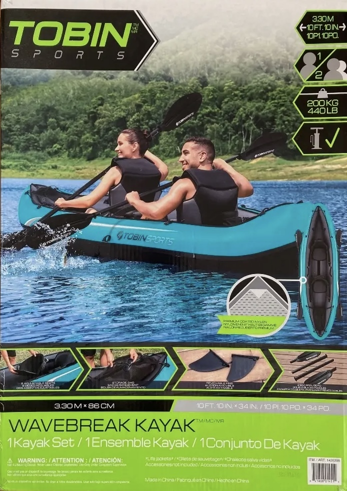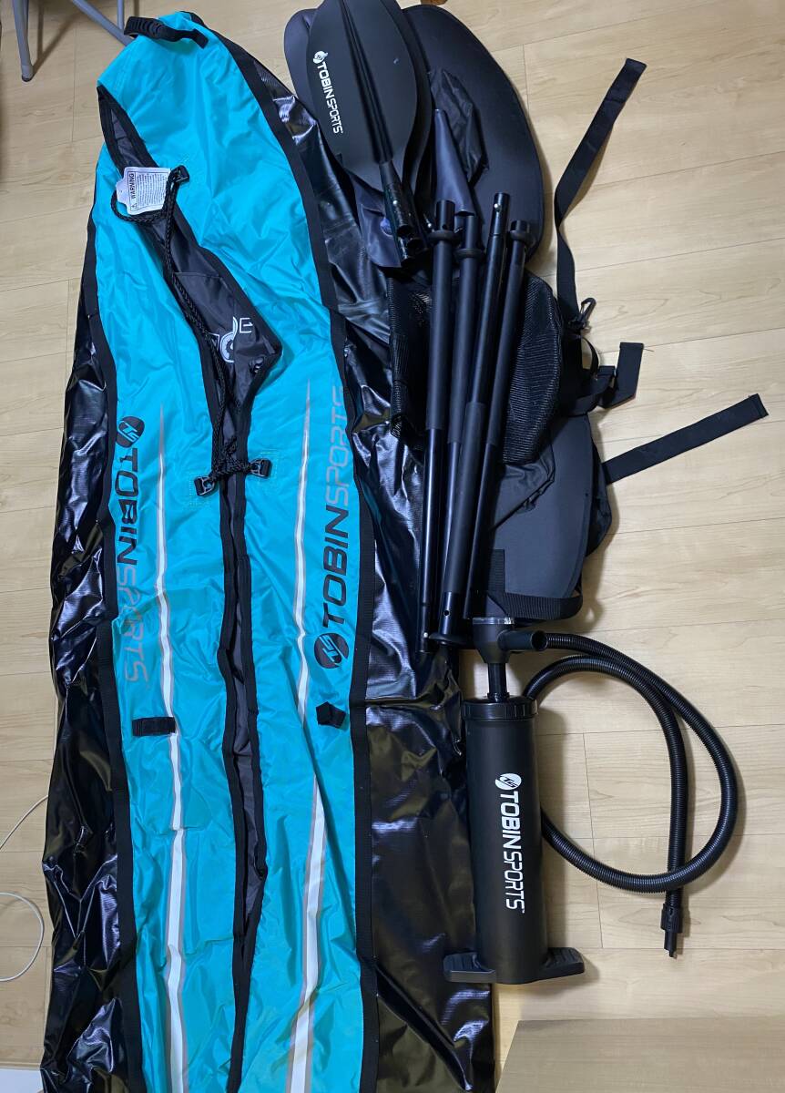 インフレータブルカヤック二人乗りです。ポンプ、オール2本、フィン、その他備品が付いたセット品です。