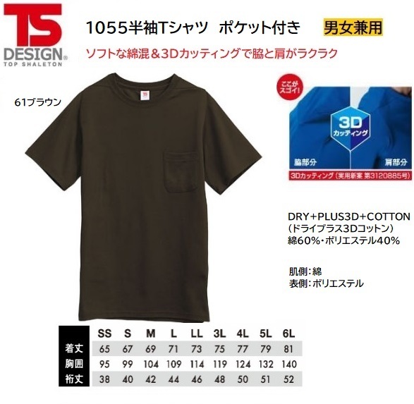 [ネコポス発送/1枚]★TSDESIGN 1055半袖Tシャツ ポケット付き【61ブラウン・Mサイズ】定価3000程度の品、即決880円!!