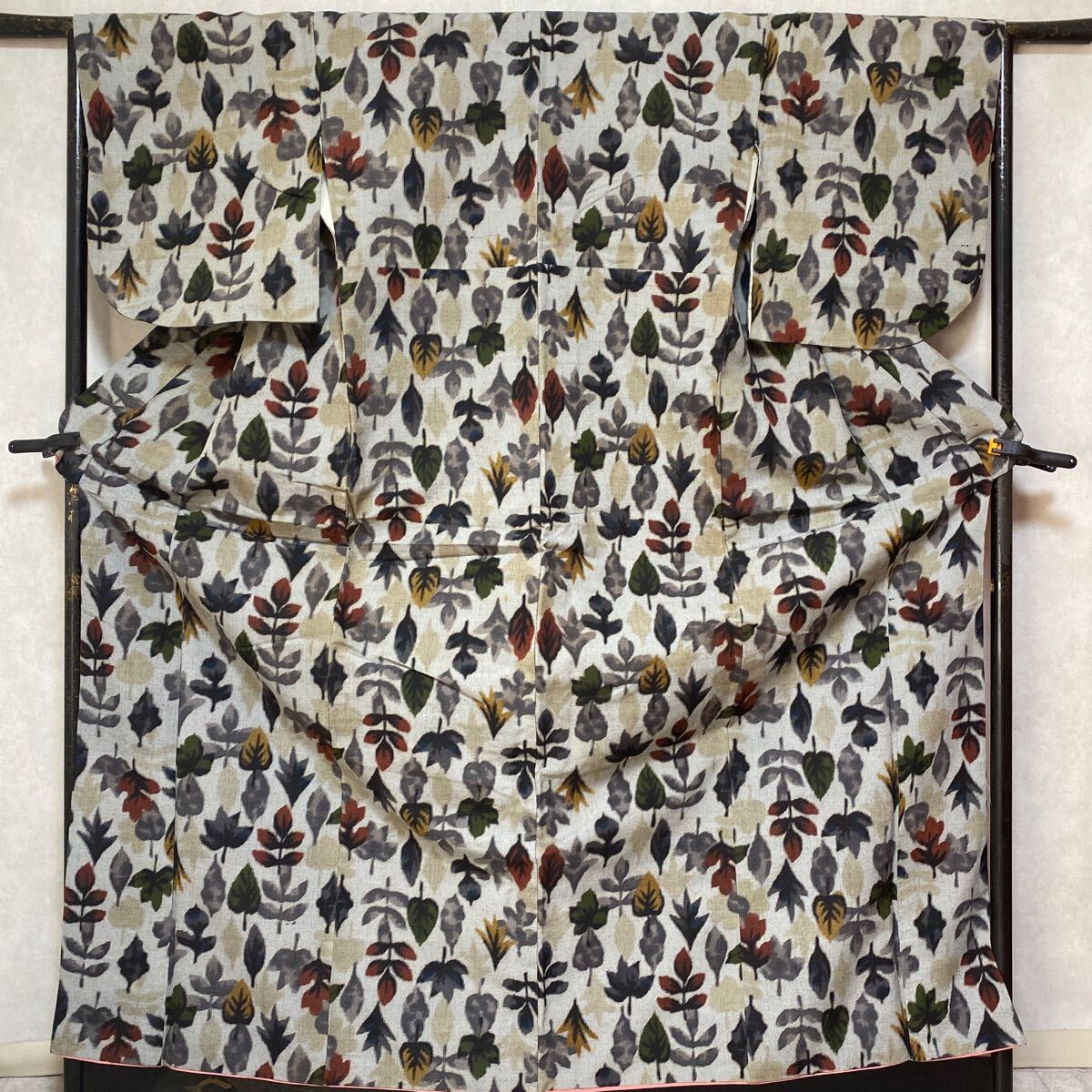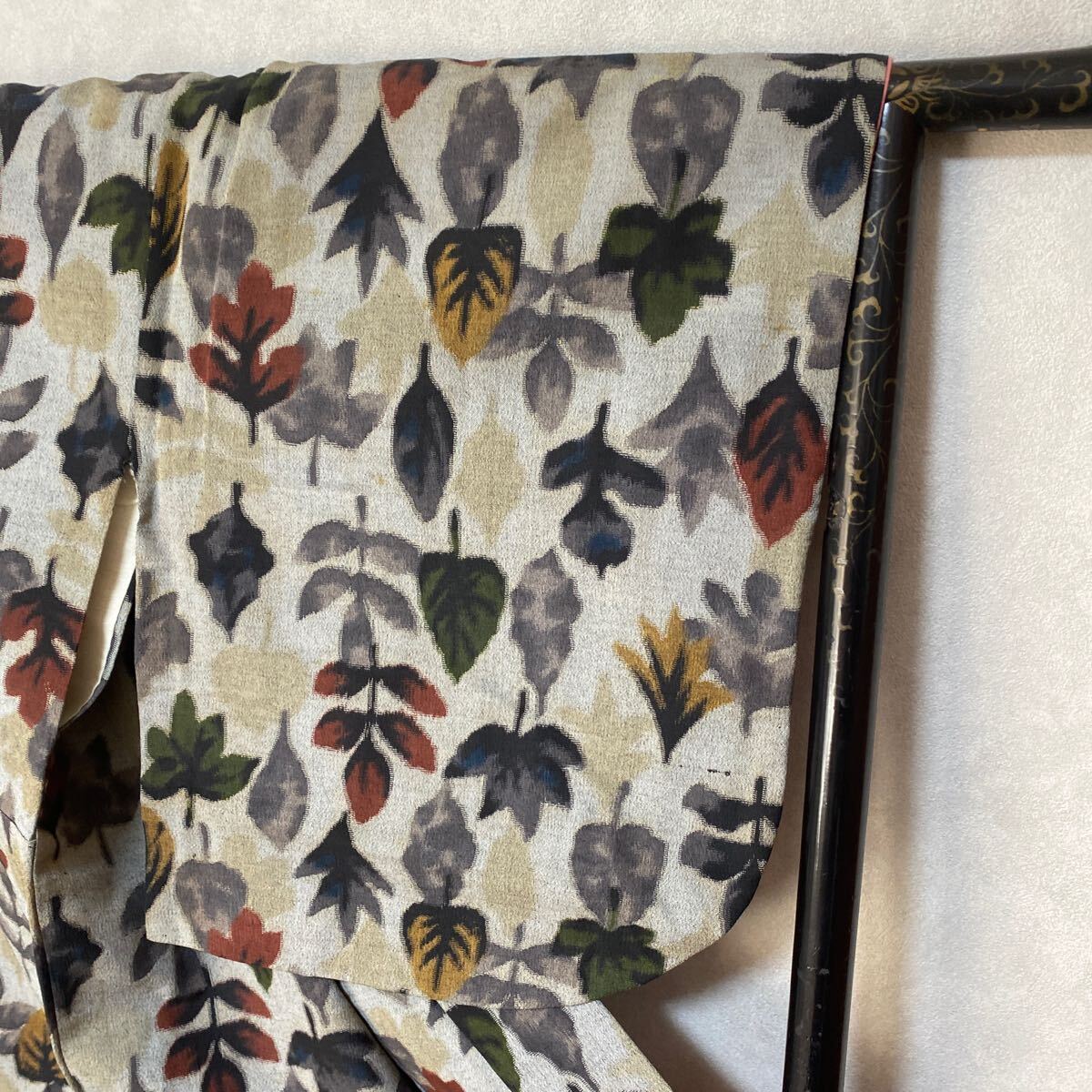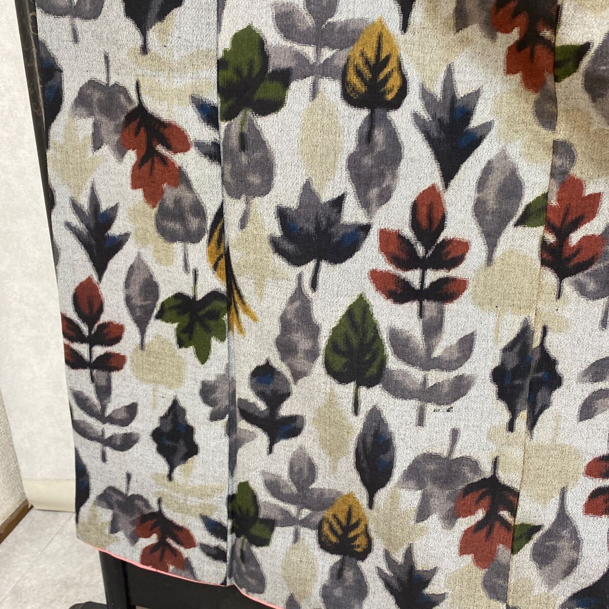 アンティーク 着物 小紋 グレー 赤緑黄 木 葉 銘仙 正絹 昭和レトロ 大正ロマン モダン 和洋折衷コーデ リメイク 25こ10-9s