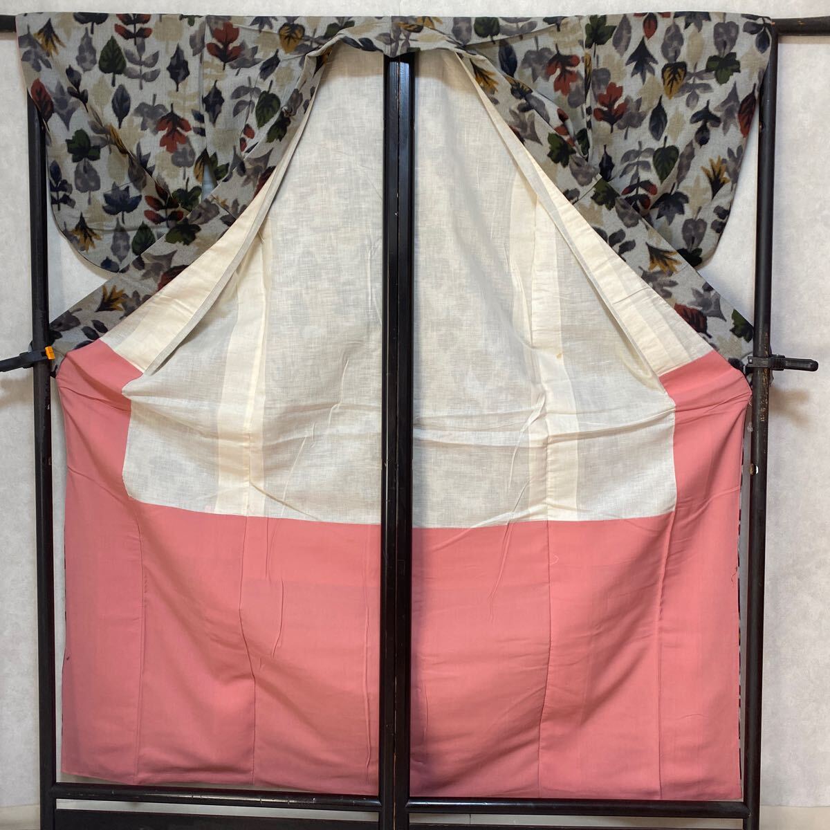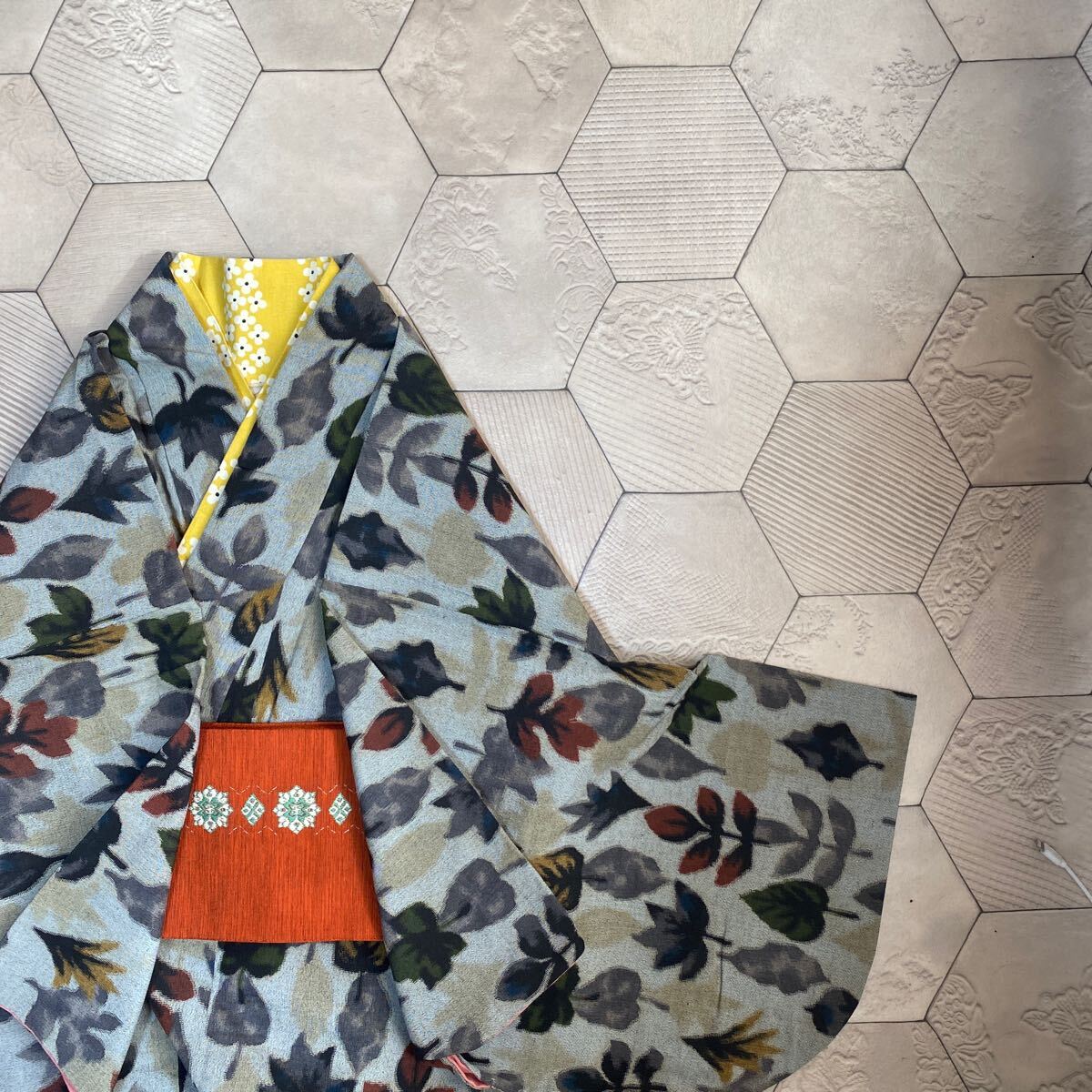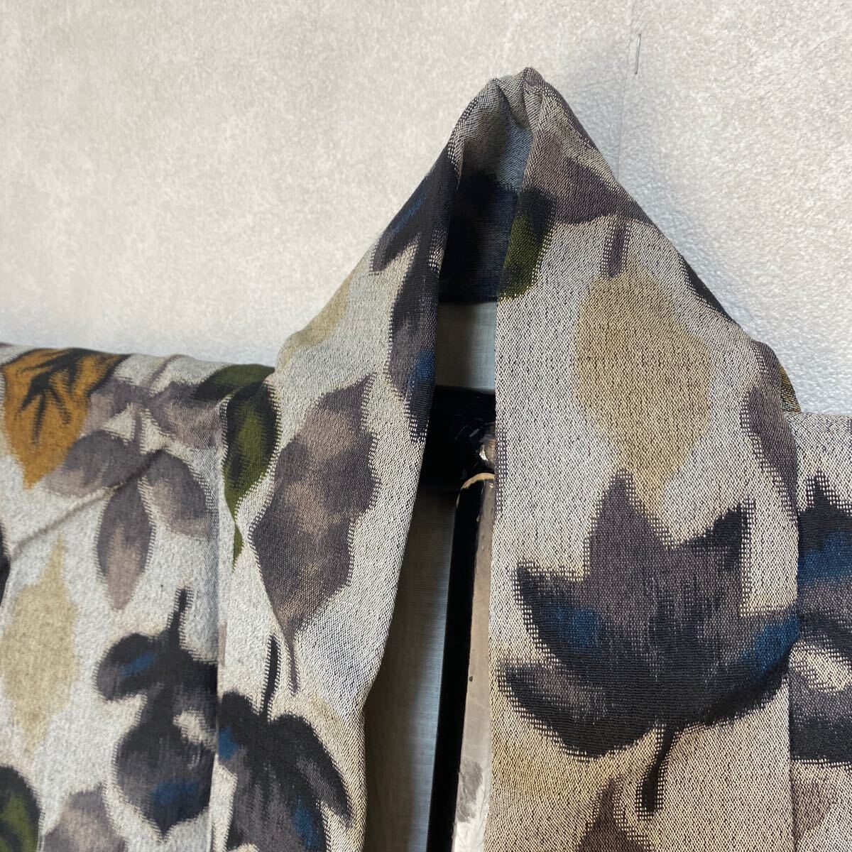 アンティーク 着物 小紋 グレー 赤緑黄 木 葉 銘仙 正絹 昭和レトロ 大正ロマン モダン 和洋折衷コーデ リメイク 25こ10-9s