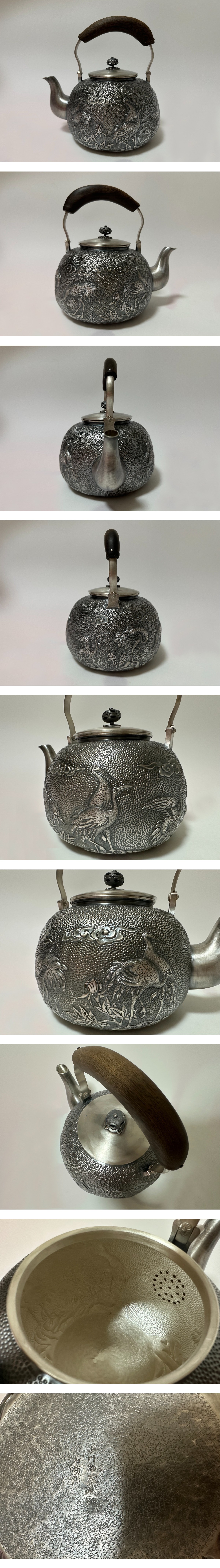 時代 純銀製 中川浄益造 槌目地 雲鶴浮彫文 湯沸 工芸品 古美術品 銀瓶 煎茶道具 重さ1520G 容量2500ml