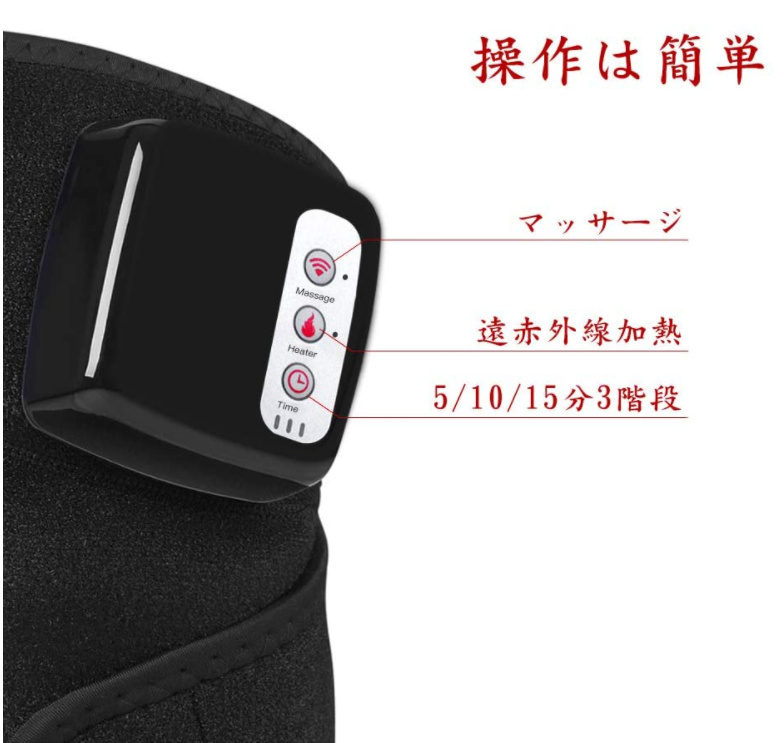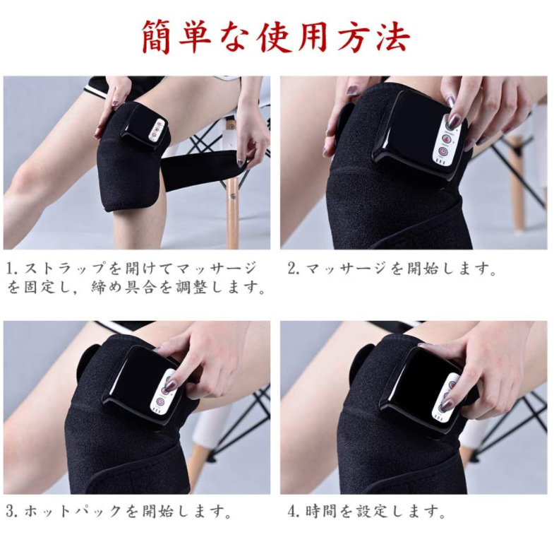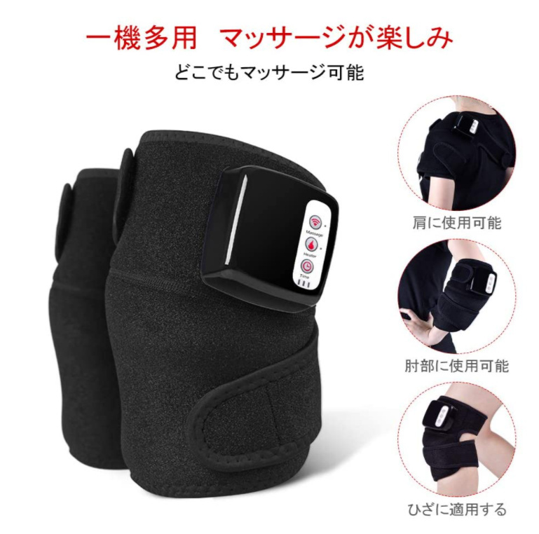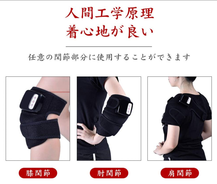 【特徴】自宅、オフィス、車内等の場所でマッサージできます。そして、人間工学に基づいて開発されたホットマッサージで、任意の関節部分に固定することができます。膝だけではなく、肩、肘にも対応しています。