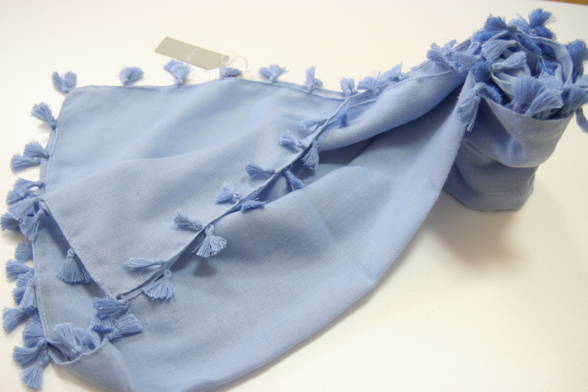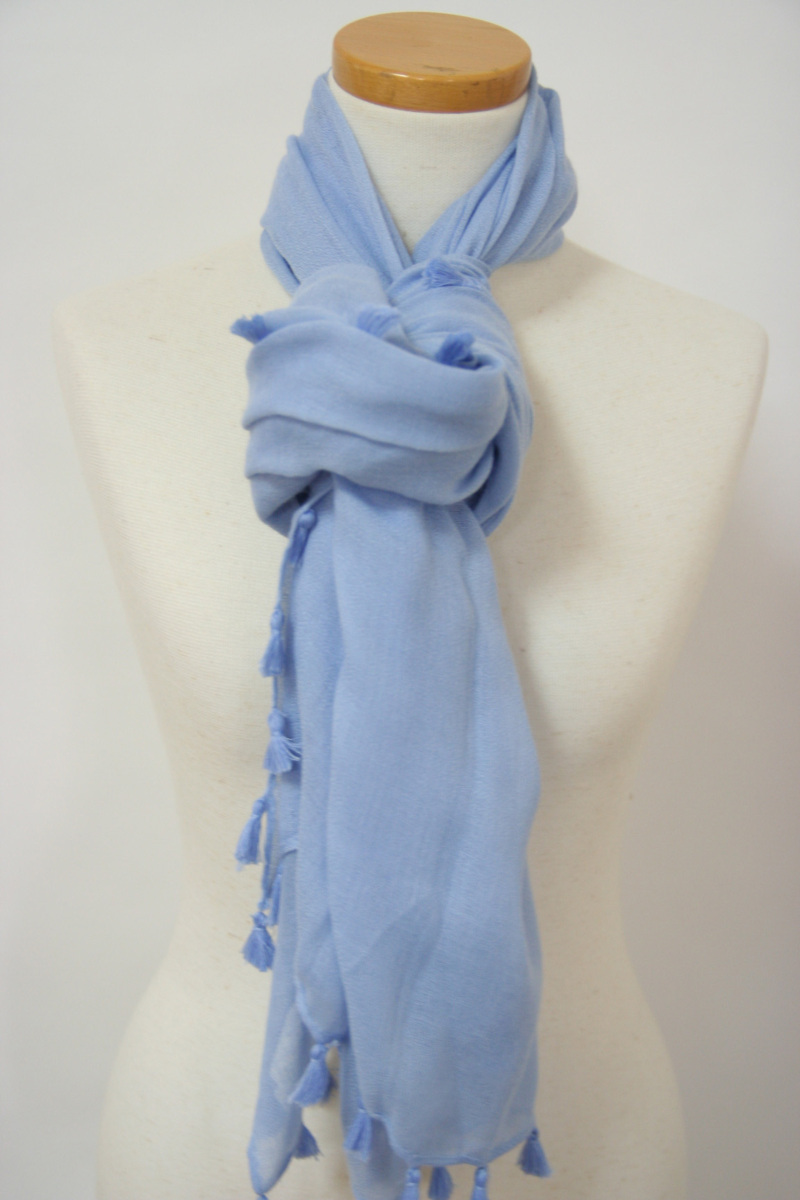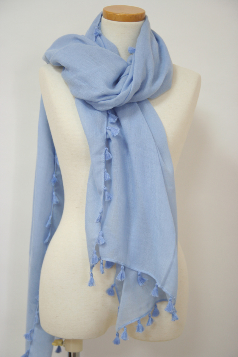 送料無料◆通年タイプ◆プレーンカラー◆日焼け&紫外線対策◆お洒落アイテム◆ショール◆タッセル付き◆大判ストール(サックス)176008