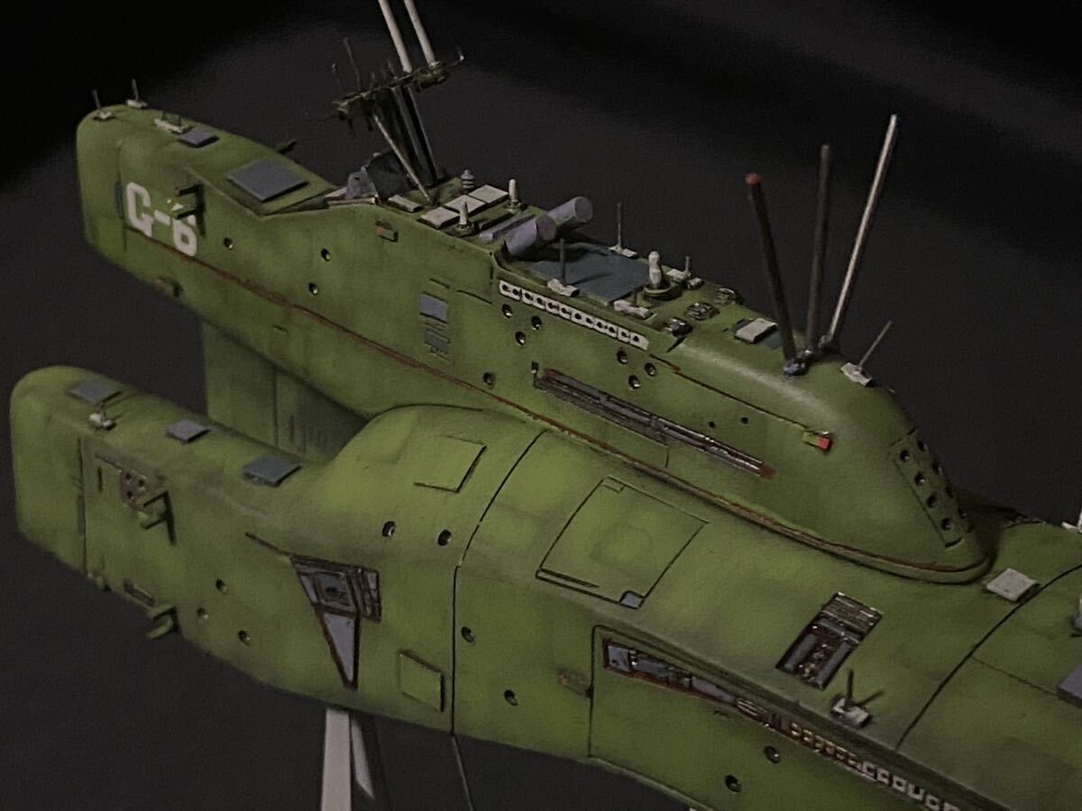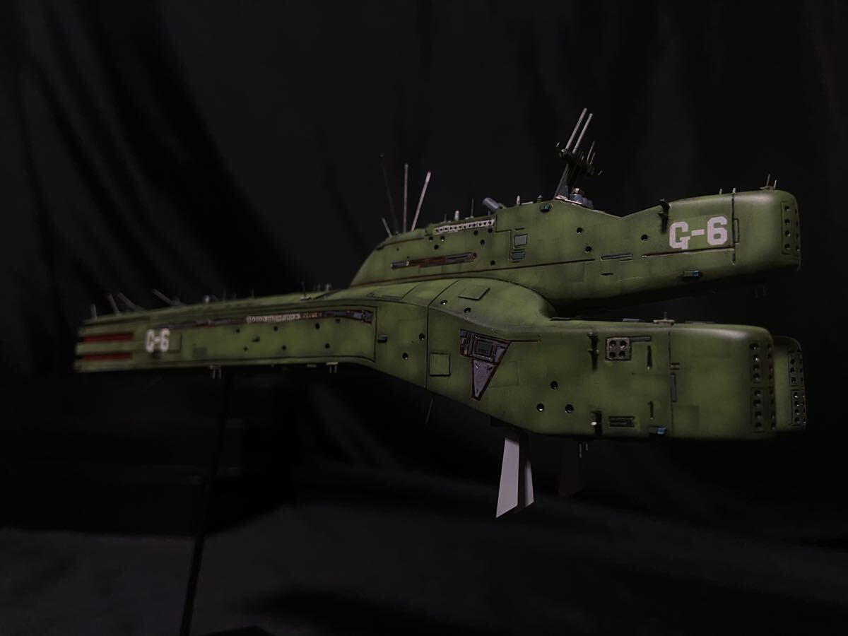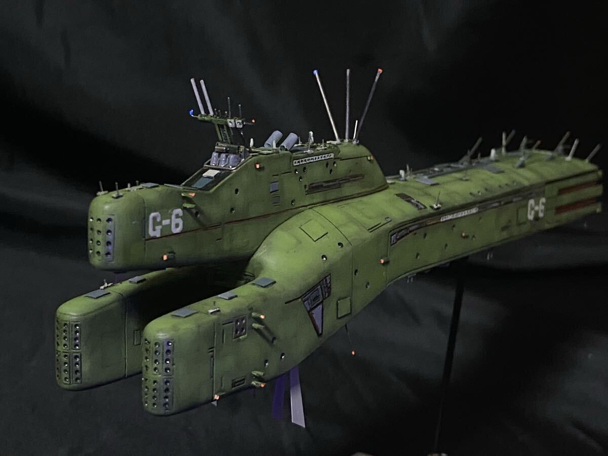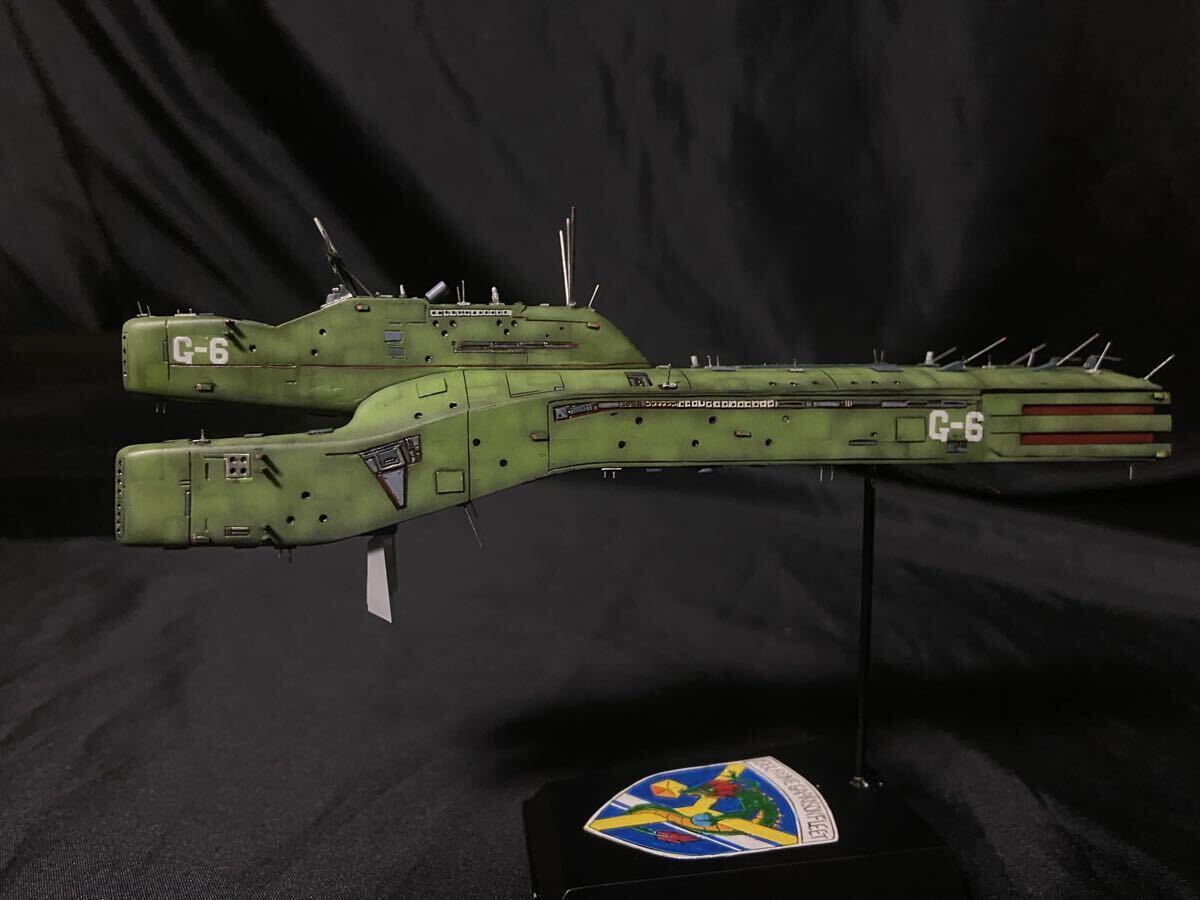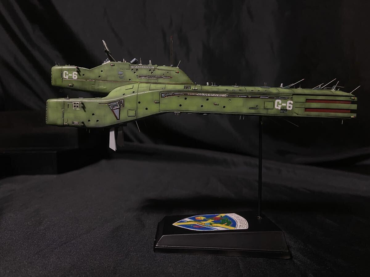 アルバクリエイツ製のキットを製作した物です。設定どうりの見事な曲線と直線を組み合わせの船体を再現してますが、船体下面のディテールが全く無いので、フリートファイルコレクションをを参考にプラ材、円筒タンク、1/5000スターデストロヤーのメカディテールの移植などで極力再現してます,船体上部に鉄道模型のパーツなどを流用してディテール、センサーなど追加。船体各部にプラ材によるパッチを26箇所追加。真鍮線による小アンテナを44箇所追加(内プラ材による基部付き33箇所。空母ベースなのでアムルタートで見られる後部上部の斜め大型アンテナを真鍮線0.4ミリで6箇所追加。艦舷灯をプラ材で16箇所追加。艦首側面の測距儀をプラ材で12箇所追加(真鍮線による補強済み)鉄道模型のパーツを流用してメカディテールを追加。艦尾にシャトル用発進口を新造してます。