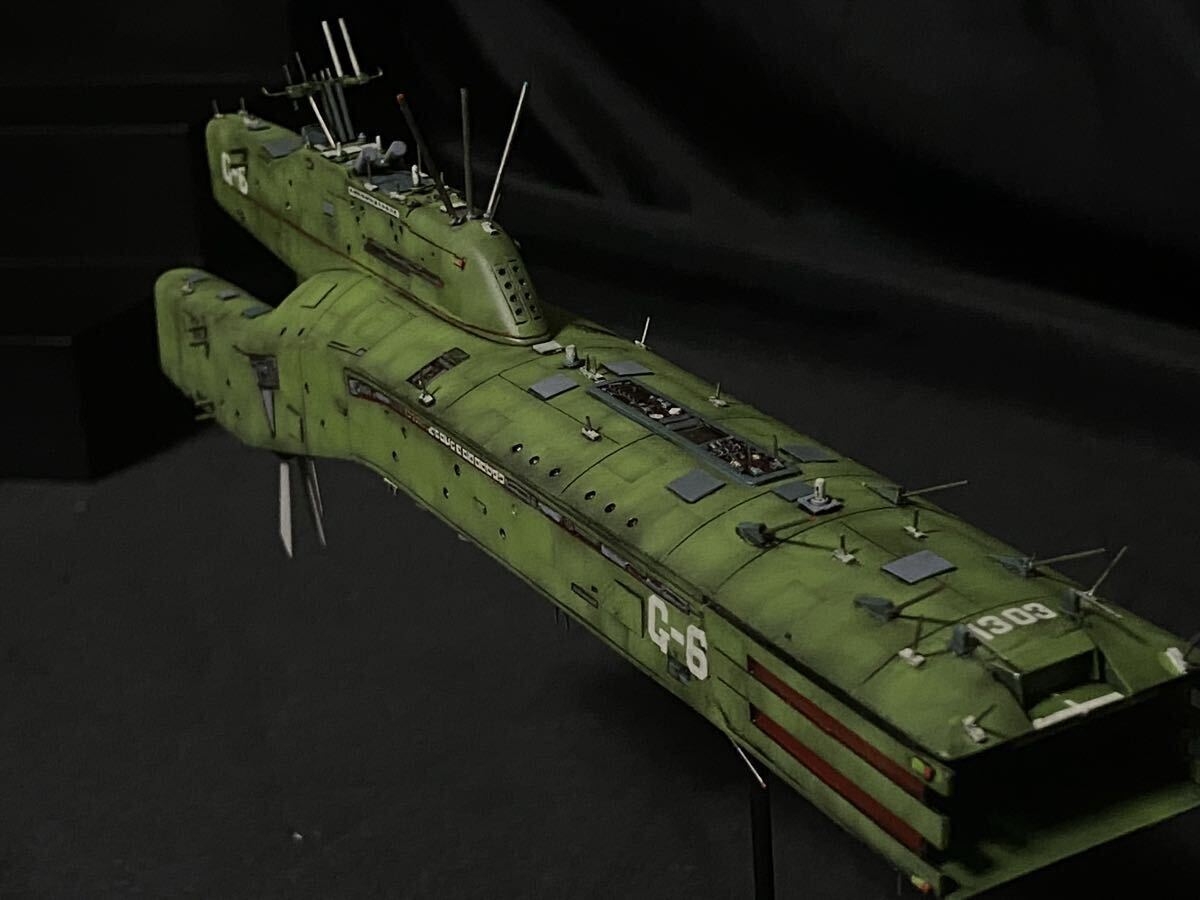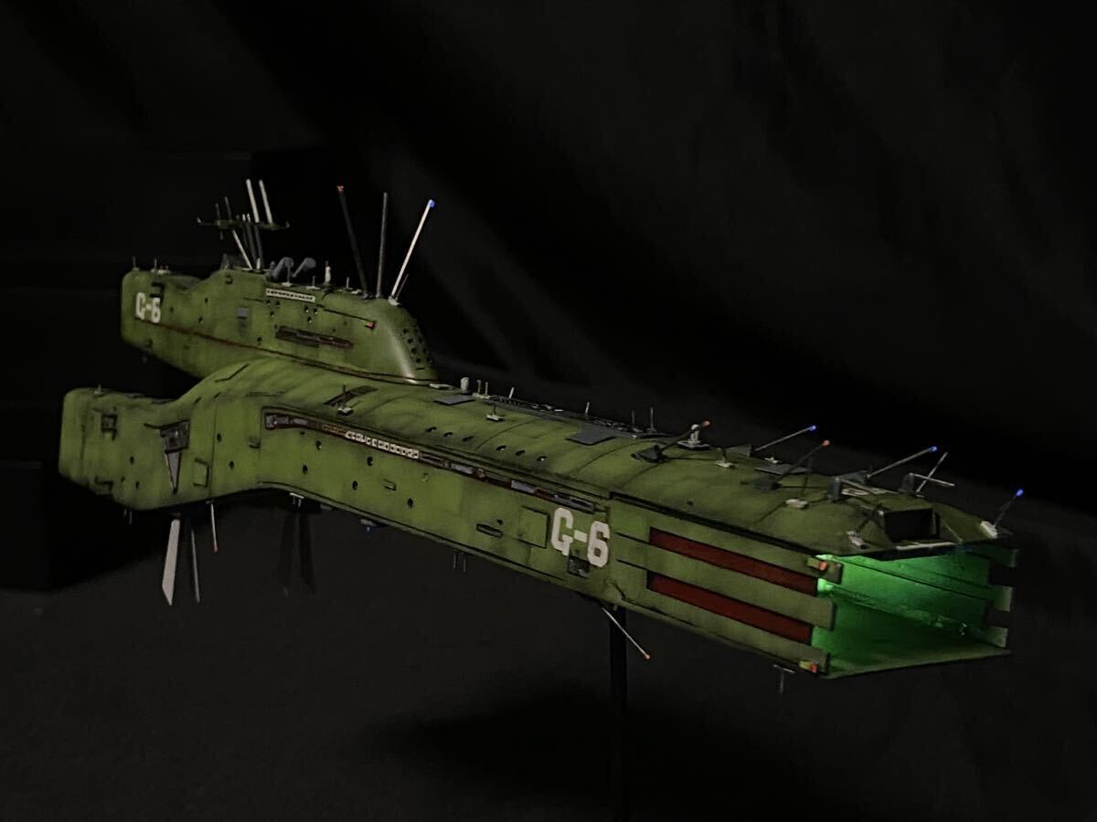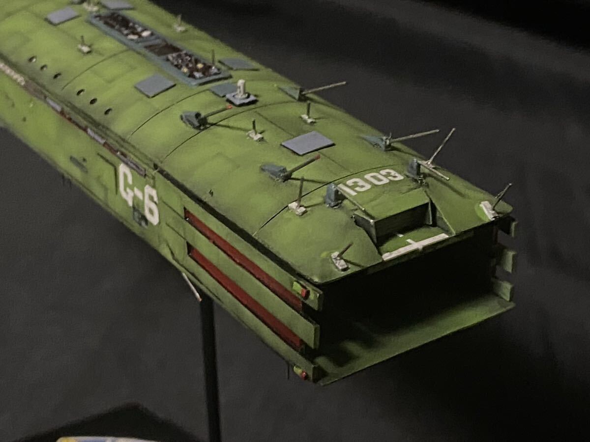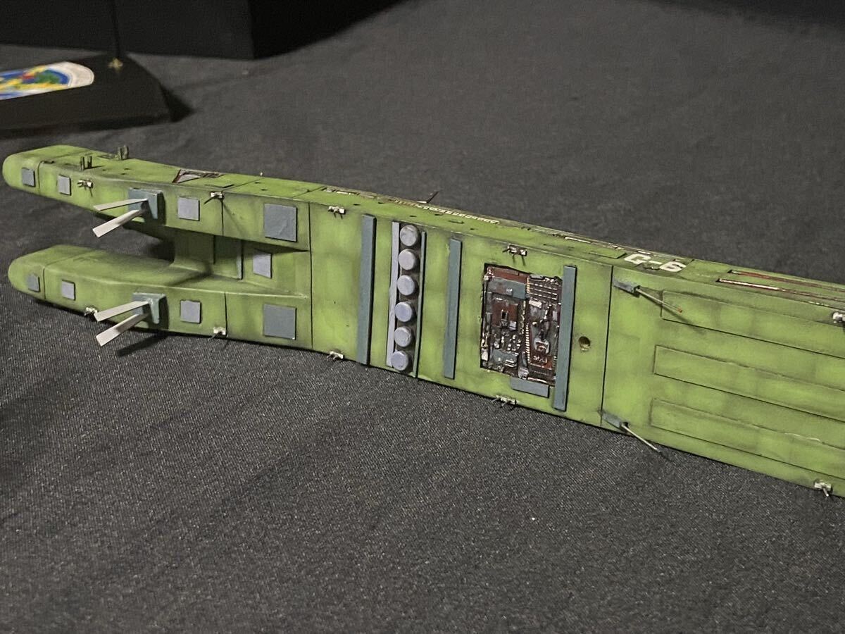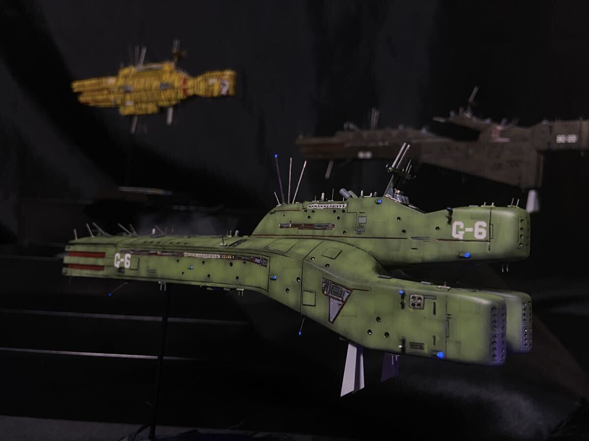 アルバクリエイツ製のキットを製作した物です。設定どうりの見事な曲線と直線を組み合わせの船体を再現してますが、船体下面のディテールが全く無いので、フリートファイルコレクションをを参考にプラ材、円筒タンク、1/5000スターデストロヤーのメカディテールの移植などで極力再現してます,船体上部に鉄道模型のパーツなどを流用してディテール、センサーなど追加。船体各部にプラ材によるパッチを26箇所追加。真鍮線による小アンテナを44箇所追加(内プラ材による基部付き33箇所。空母ベースなのでアムルタートで見られる後部上部の斜め大型アンテナを真鍮線0.4ミリで6箇所追加。艦舷灯をプラ材で16箇所追加。艦首側面の測距儀をプラ材で12箇所追加(真鍮線による補強済み)鉄道模型のパーツを流用してメカディテールを追加。艦尾にシャトル用発進口を新造してます。
