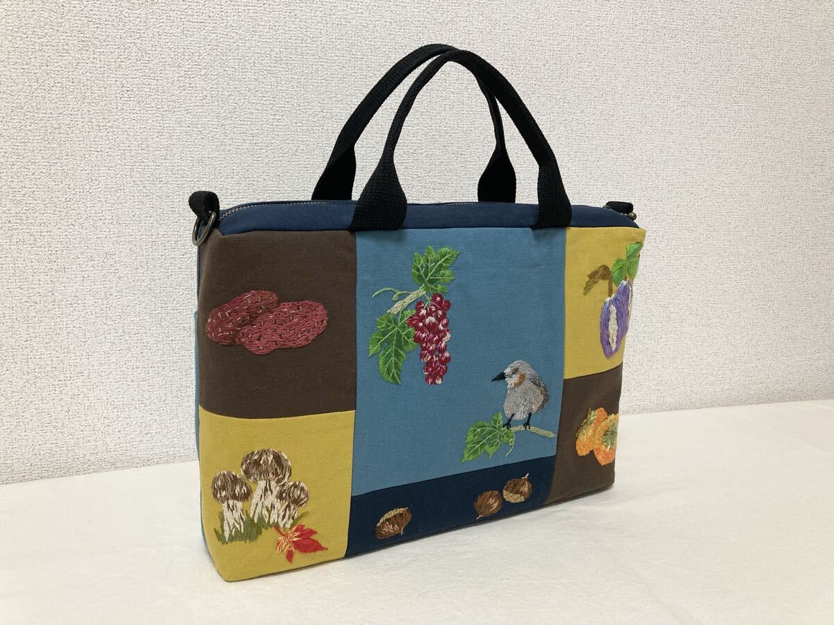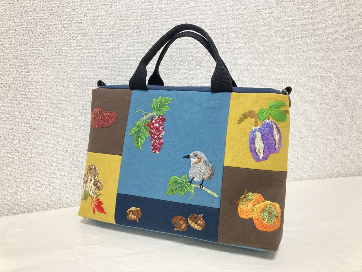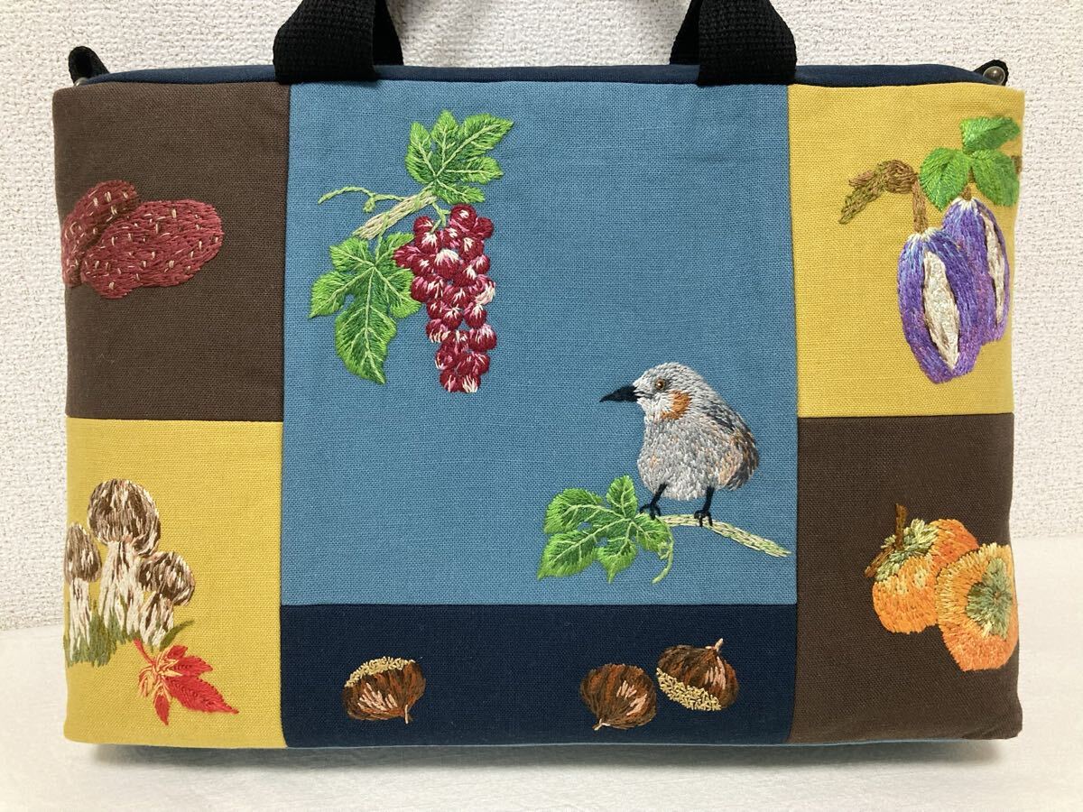 <jelyglas>ハンドメイド 手刺繍 [ヒヨドリと秋の味覚] トートバッグ Dカン付きでショルダーバッグにも カバン一点物ブドウアケビ柿栗松茸