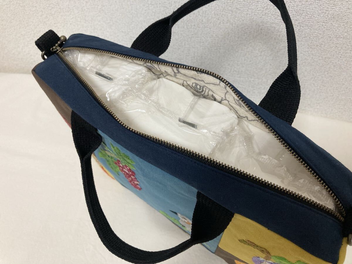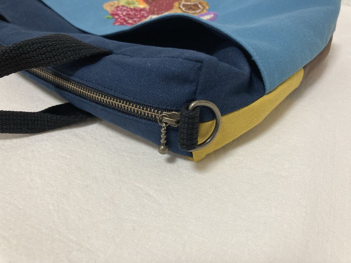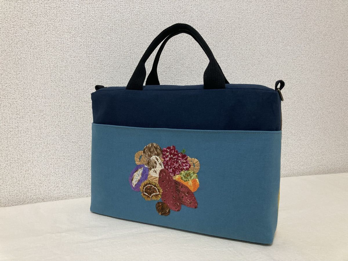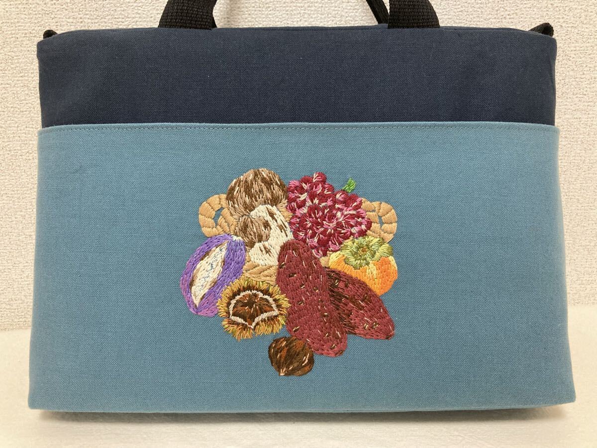 <jelyglas>ハンドメイド 手刺繍 [ヒヨドリと秋の味覚] トートバッグ Dカン付きでショルダーバッグにも カバン一点物ブドウアケビ柿栗松茸