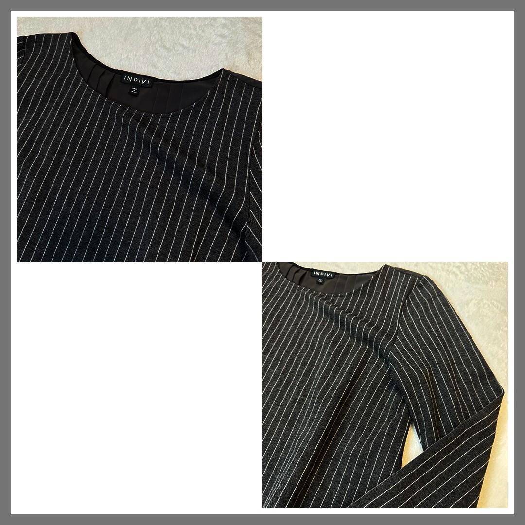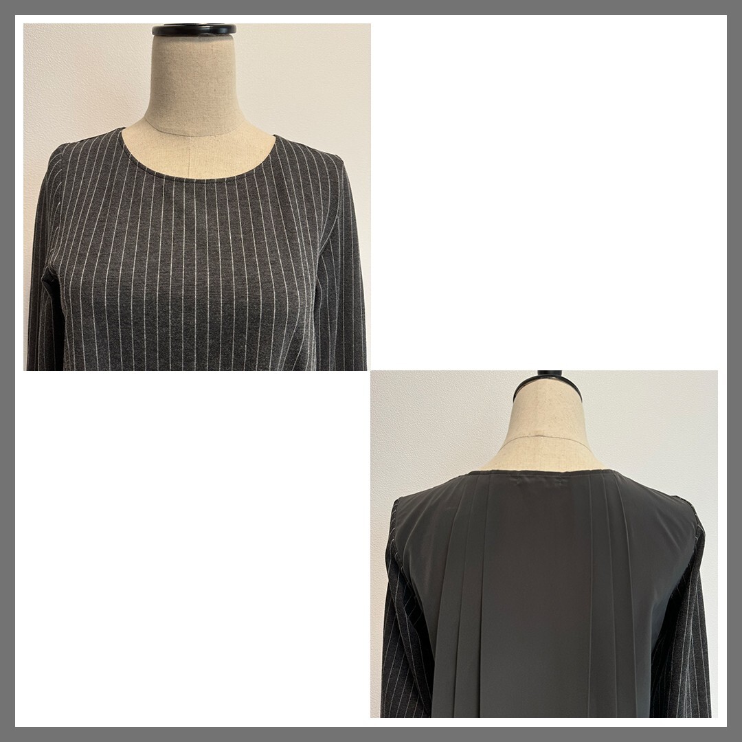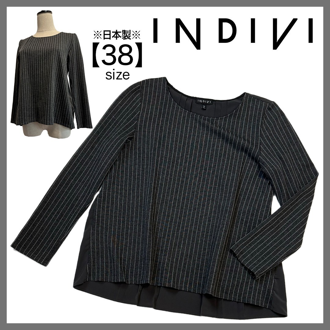 INDIVI インディヴィ ストライプ柄 コンビトップス 切り替え スタイルアップ ビジネス オフィス 大人 上品 ワールド 日本製 灰 グレー 38