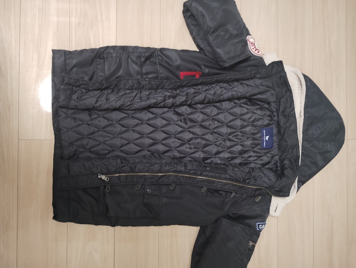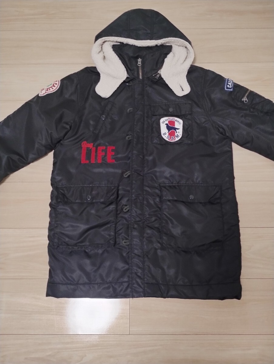 フード付きの冬物ジャケット、ボタン付きポケット付きでカジュアルなスタイルに最適。