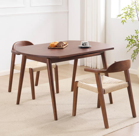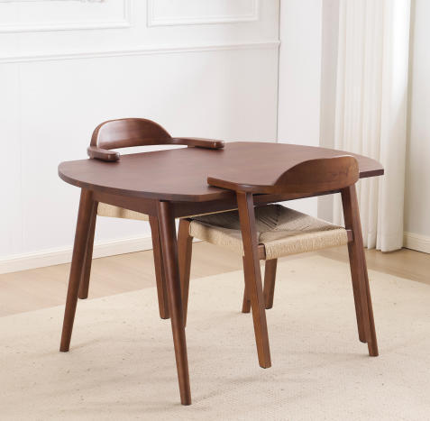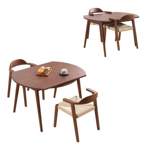 • 【90-120㎝に伸長する円形ダイニングテーブル】 最大4人での使用が可能。 天板の両側がたためる仕様。 片方を折り畳み半円での普段使い、円形に広げて使用来客や作業に対応。 収納時の折り畳みサイズは幅84*120cmになり、コンパクト収納となる。 天然木を使用し、天板はしっかり面取り加工をしているため、小さなお子様でも安心。