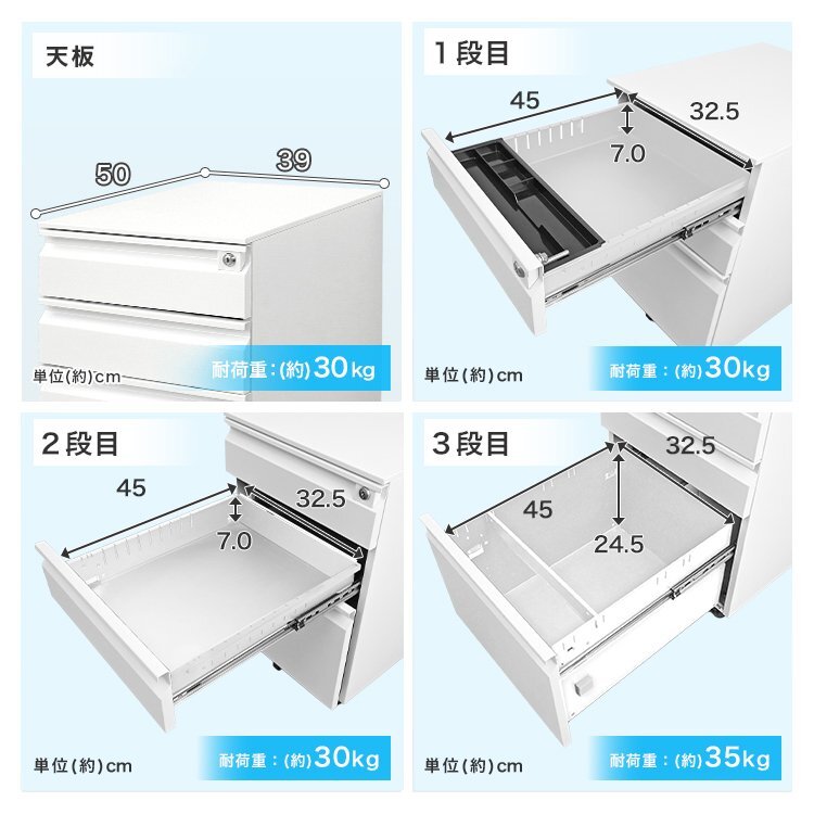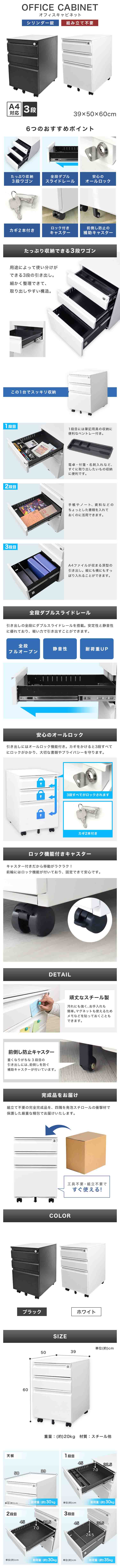 使いやすさ抜群のシンプルデザイン。 デスクに合わせやすいカラー! たっぷり収納できる大容量の収納容量! 下段はA4ファイルを収納可能。 全段フルオープンで奥の収納物も取り出しやすい! 安心のオールロック!鍵を掛けると全段ロックでセキュリティも万全です。 キャスター付きで移動ラクラク!デスクの下に入れても、デスク横に置いて作業スペースとしても使えます。 丈夫なスチール製。さらにマグネットも使えて使い方色々! 【商品仕様】 カラー:ブラック サイズ:(約)幅390×奥500×高さ600mm 引き出し内寸:上段:(約)幅325×奥行450×高さ70mm 中段:(約)幅325×奥行450×高さ70mm 下段:(約)幅325×奥行450×高さ245mm 重量:20㎏ 耐荷重:天板:(約)30kg 上段:(約)30kg 中段:(約)30kg 下段:(約)35kg 【注意事項】 ・全ての引き出しを全開にしないでください。転倒の恐れがあります。 ・サイズは若干差異が生じる場合がございます。予めご了承下さい。 ・商品は、モニターによって色合いが異なって見える場合があります。 ・仕様・デザインは改良のため予告なく変更することがあります。 |