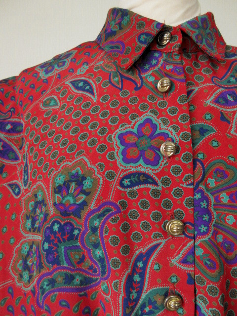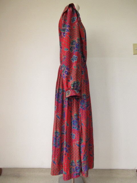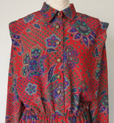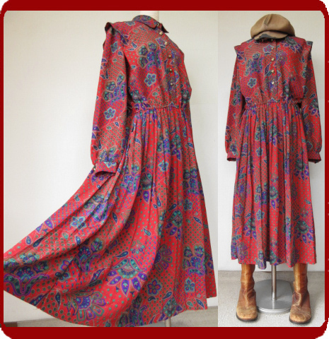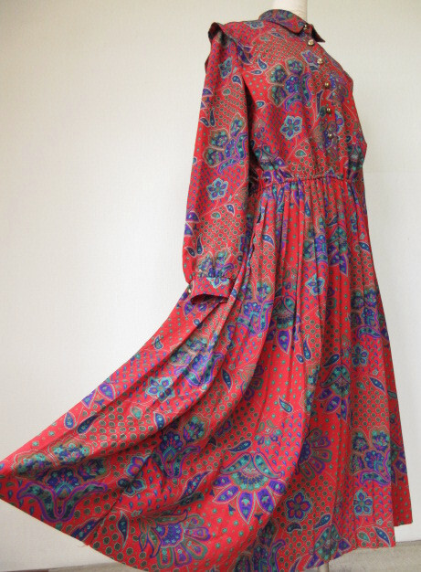 ♪古着レトロ・Vintage赤ペイズリー柄プリーツワンピ♪