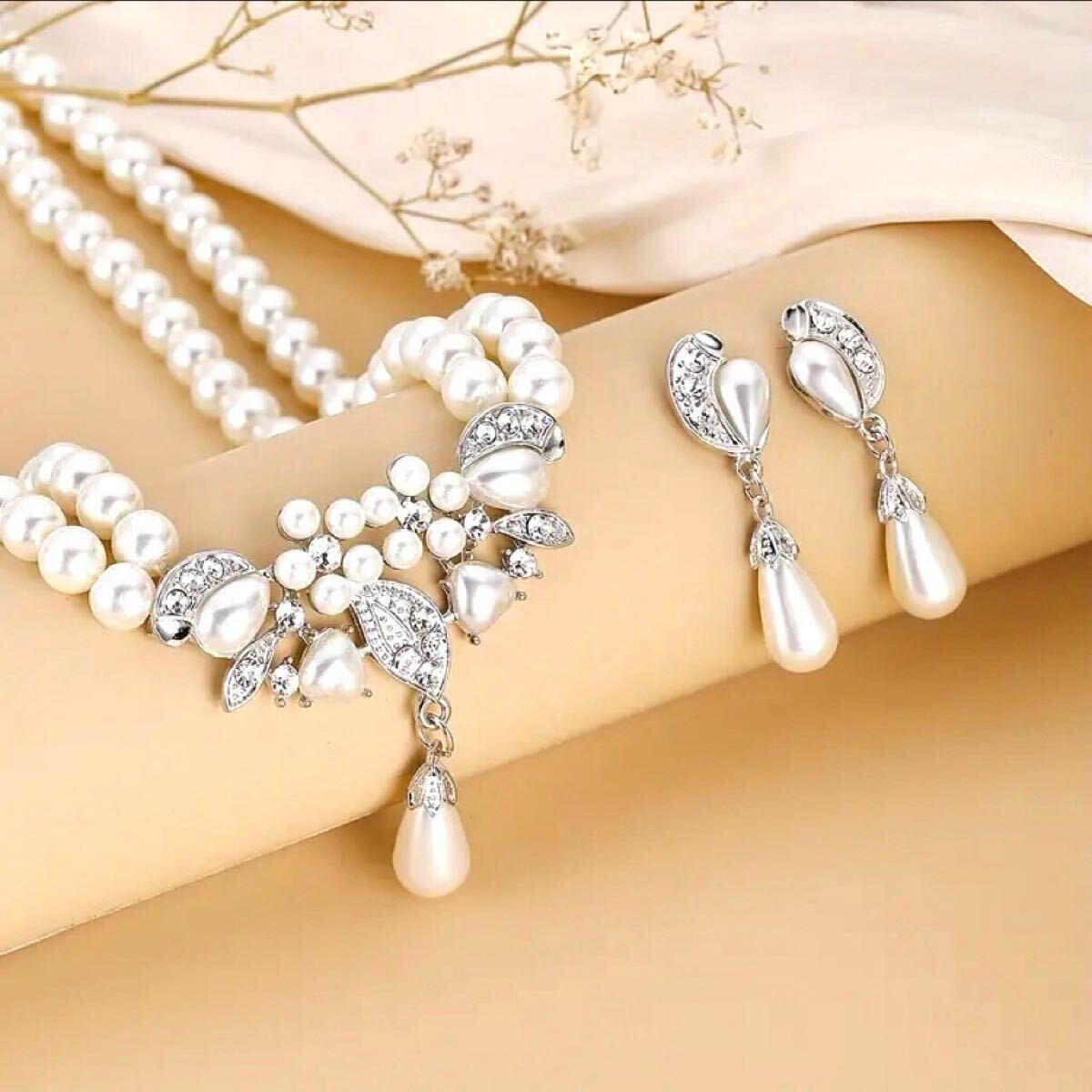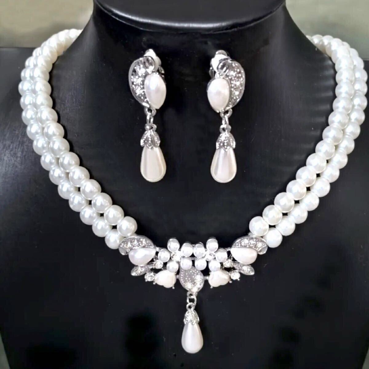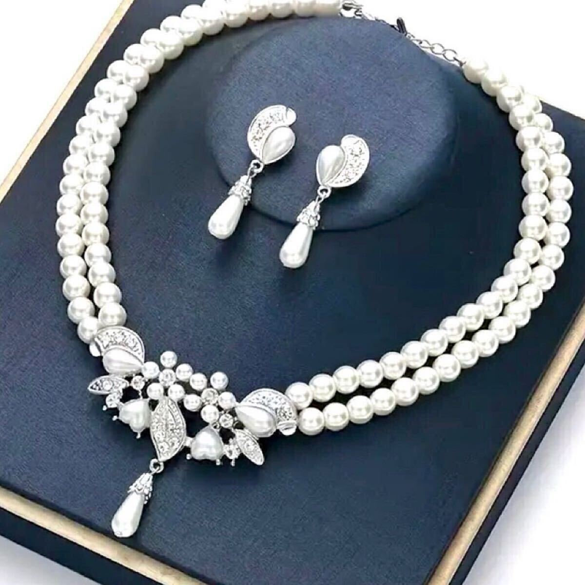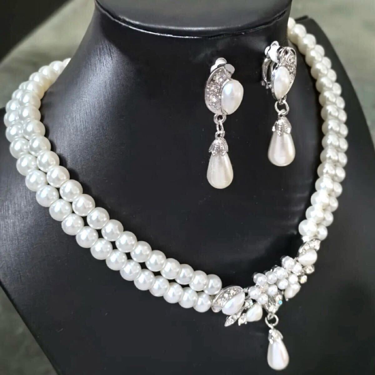 ヨーロッパ風 フェイクパール調 ラインストーン イヤリング&ネックレスの2点セット◎