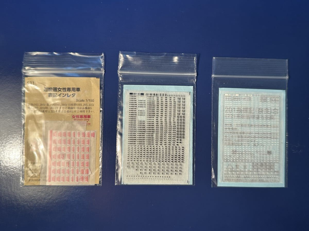 おまけは使用した女性専用車インレタの余りと、201系(奈良)の車番インレタ黒と白(一部使用済)です。