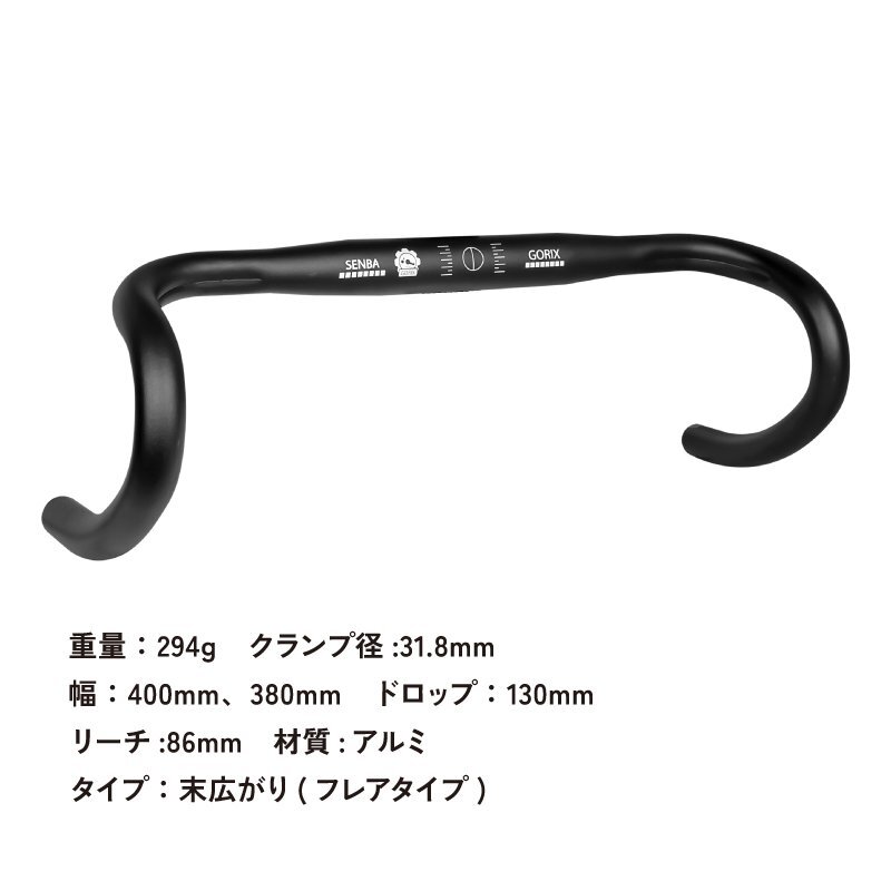 下ハンドルが広がっているのが特徴のフレアハンドル。 ショートリーチでブラケットが握りやすいタイプ。 エンド部分に向けて末広がり。 ロードバイクの他にもオフロード走行を目的としたシクロクロスやグラベルロード、ツーリング車等におすすめ。 [フレア形状] 下ハンドルが広がっているのが特徴のフレアバー。 (エンド部分に向けて末広がり) 上ハンドルを狭く、下ハンドルを広くする事でポジションを柔軟に変更できます。 [ショートリーチ] ショートリーチでブラケットが握りやすい。 手の小さい方やブラケットを近くした方にもおすすめです。 [耐久性] 軽量で丈夫なアルミ材質 [センターライン] ハンドル交換の際に調整しやすいセンターラインとメモリ 商品内容ドロップハンドル 幅380mm クランプ径31.8mm 重量294g ※400mm ドロップ130mm リーチ86mm 材質アルミ タイプ末広がり(フレアタイプ) |