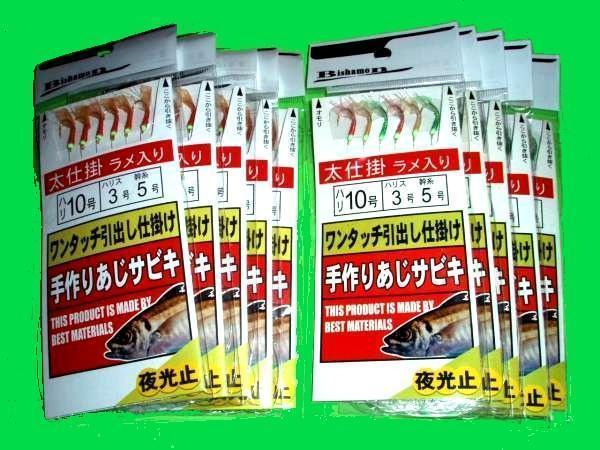 商品説明 | 青物に!太仕掛サビキ 10号 10枚 サビキ 引きの強い サバ や ソーダカツオ も ハリス 3号 でOK ! ピンク 5枚、 ミックス 5枚 幹糸 5号 6本針 枝長 5cm 枝間 25cm 全長 175cm |