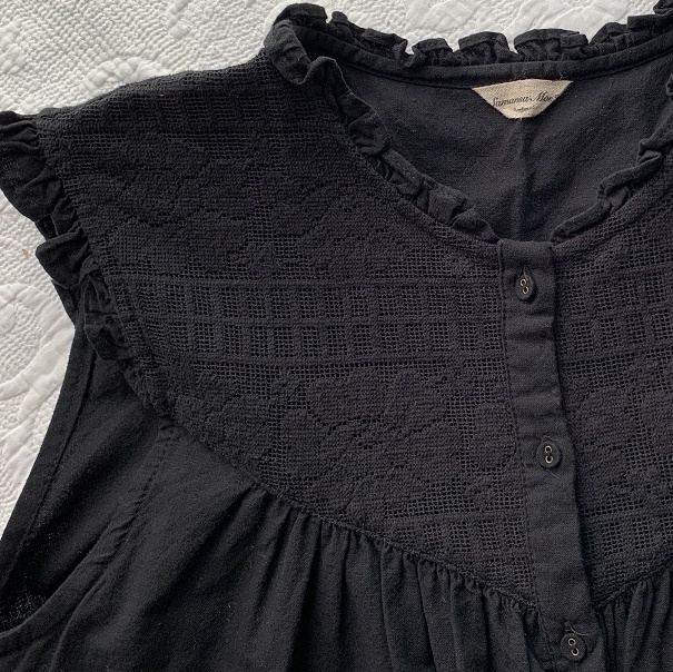 襟元と袖にフリルが施され、胸元には薔薇が素敵なフィレレース