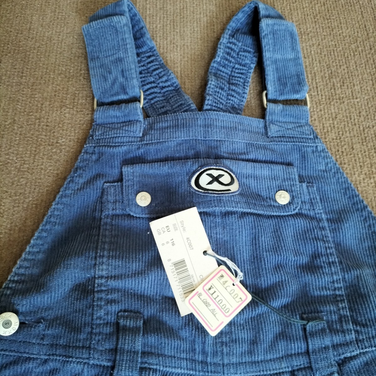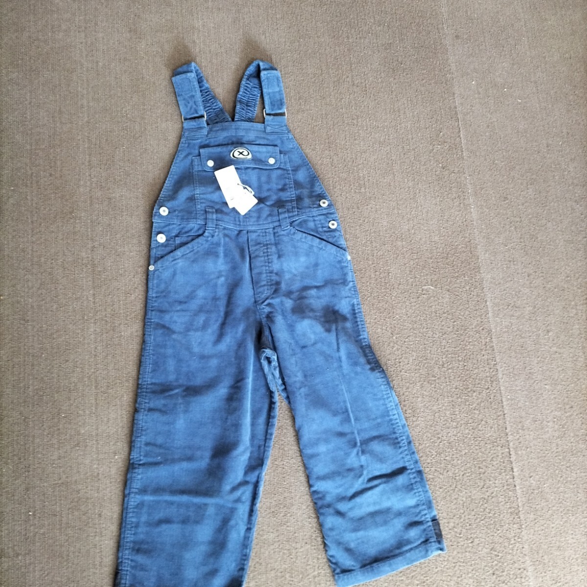 コーデュロイ素材の青色オーバーオール。前面と後ろにポケット付き。