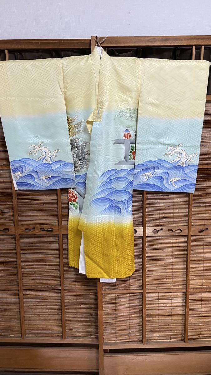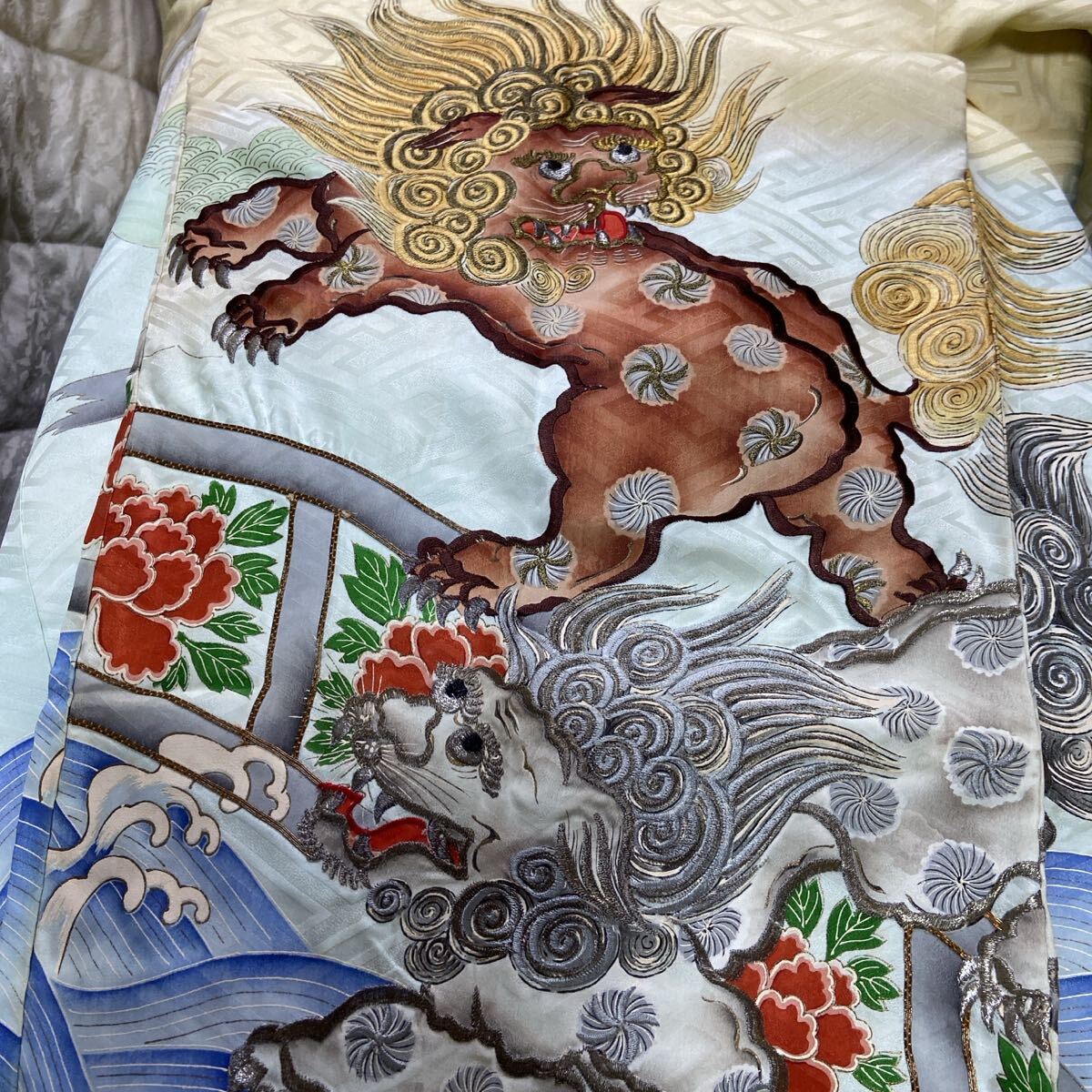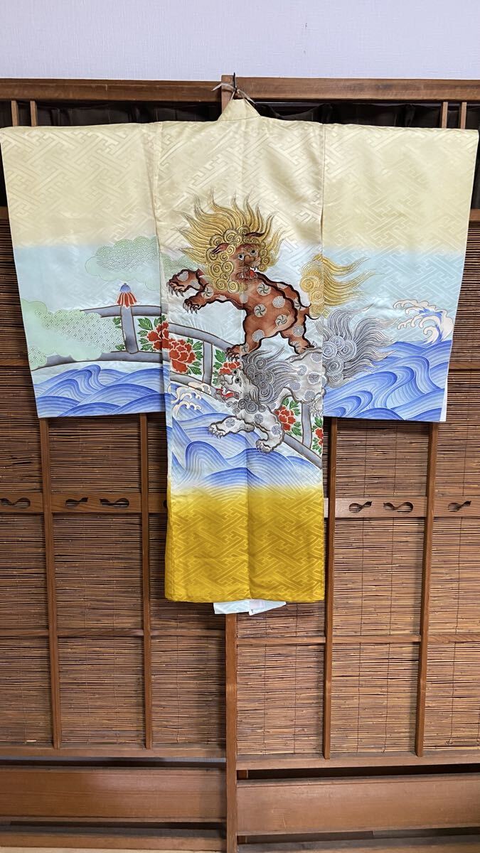 獅子と波の美しいデザインの着物、特にお宮参りに最適。