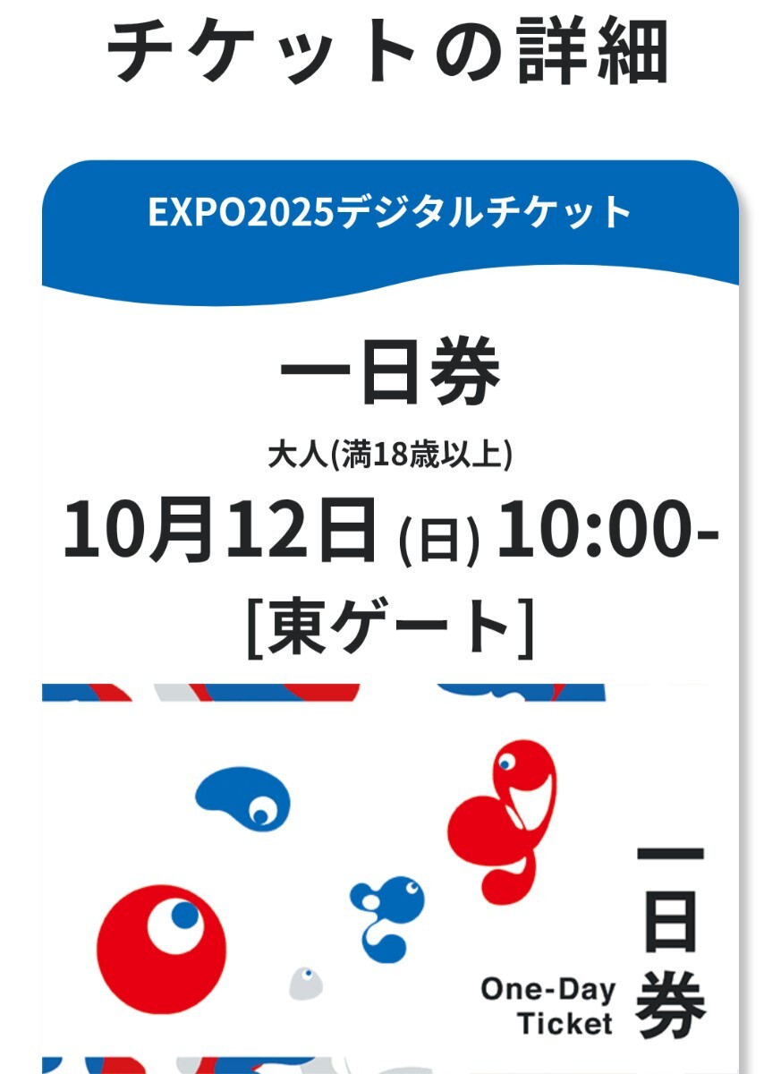 10月12日(日曜日)東ゲート10時予約済み大阪万博入場チケット大人1枚の出品です。急遽都合により行けなくなりましたので出品いたします。