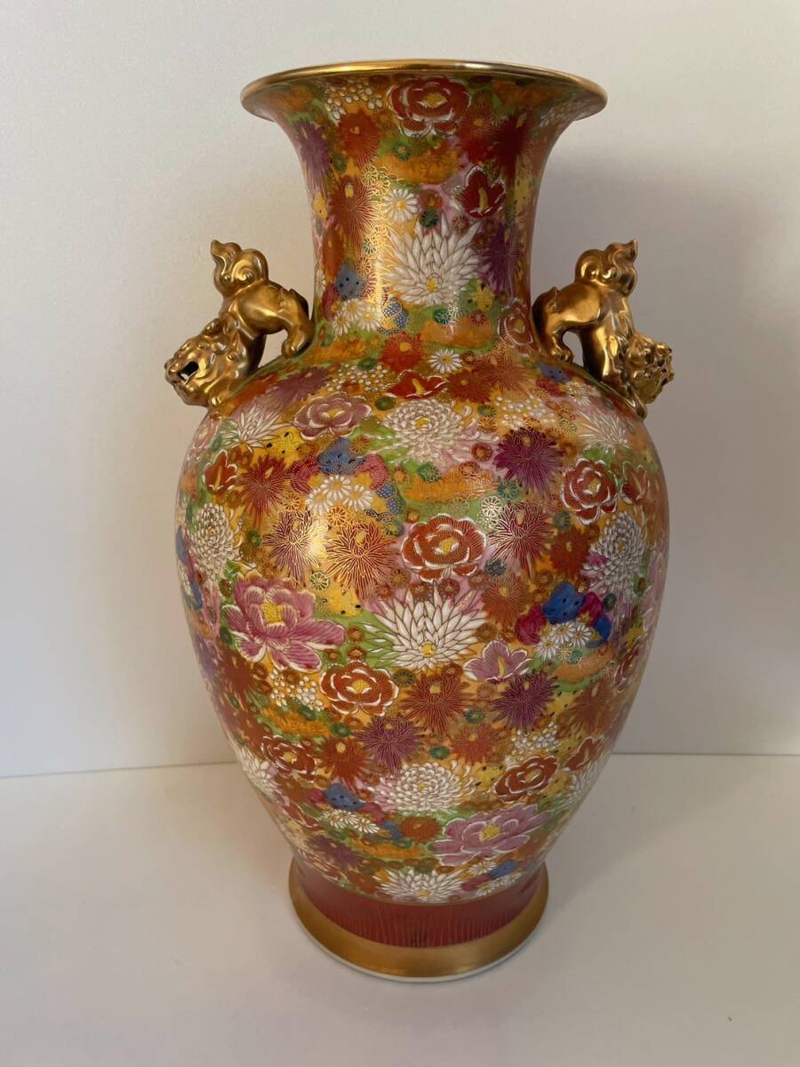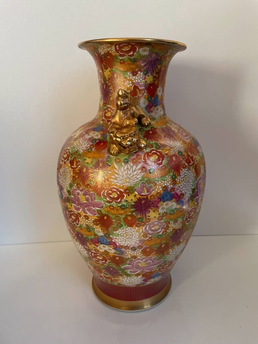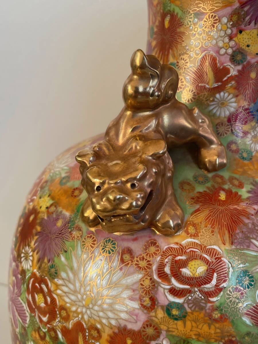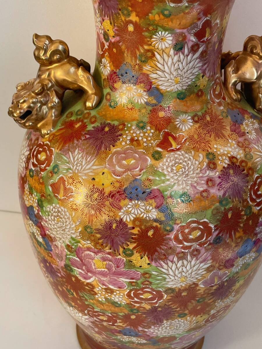 【和美】高さ46.2㎝ 九谷焼 光峰 錦彩花尽獅子耳付 大花瓶 本物保証 花瓶 壺 大壺 花器 15
