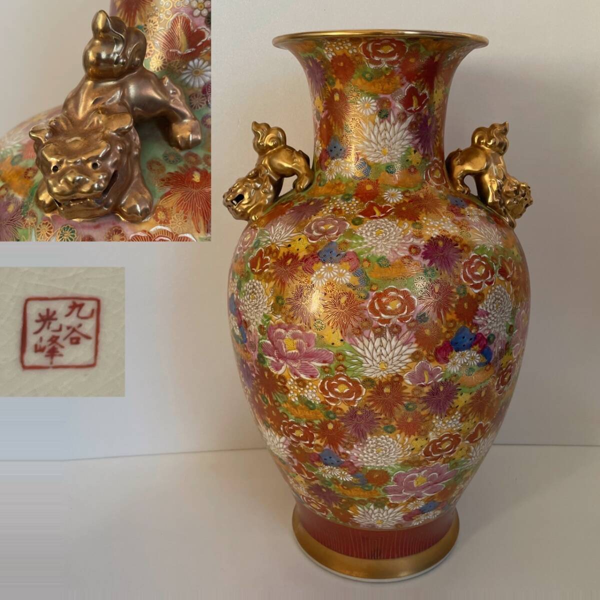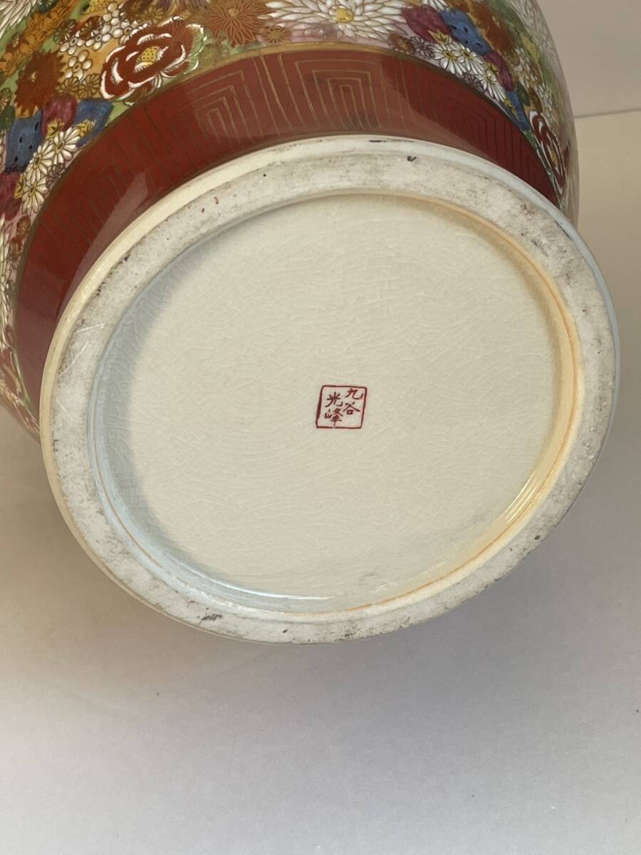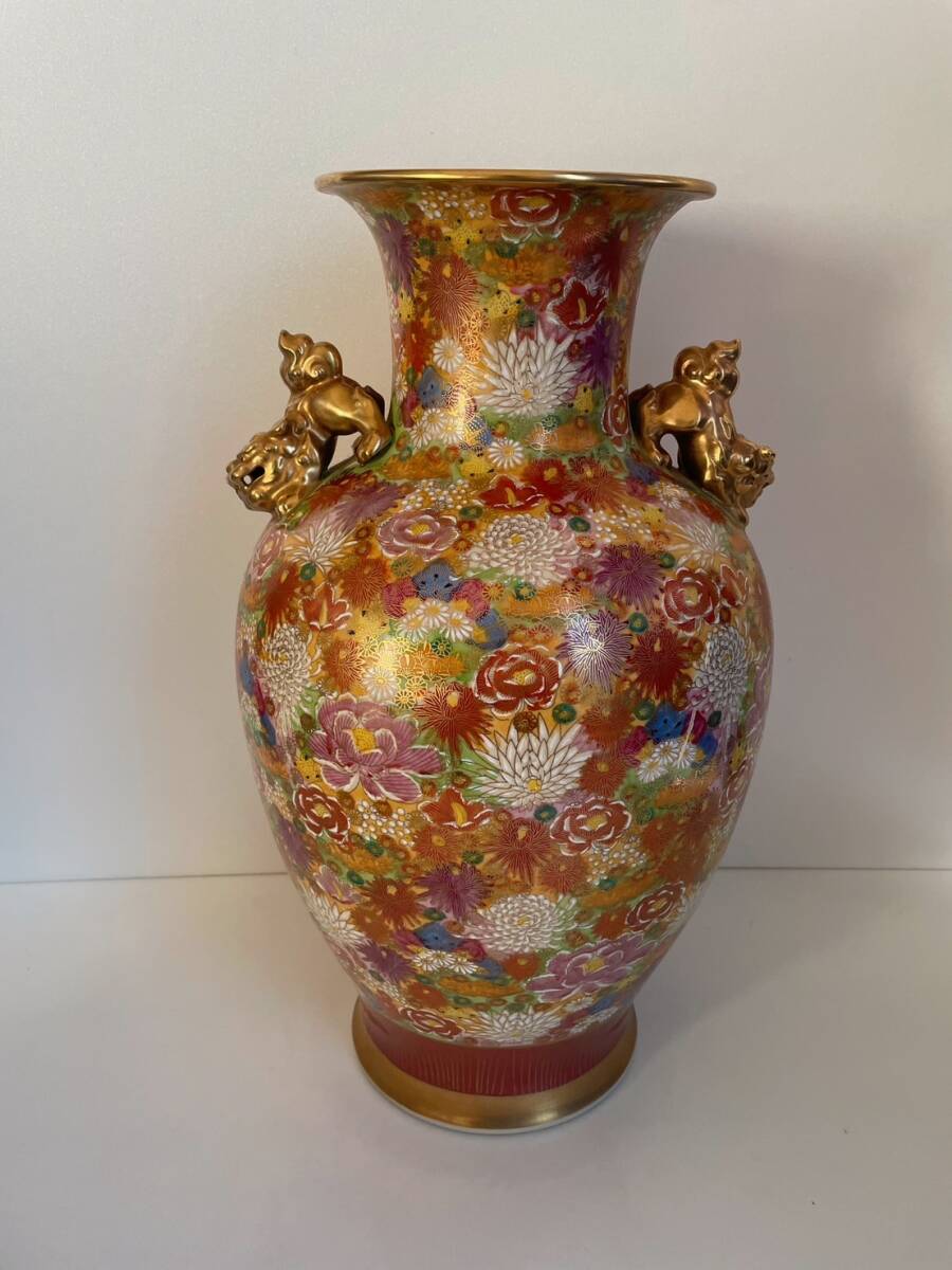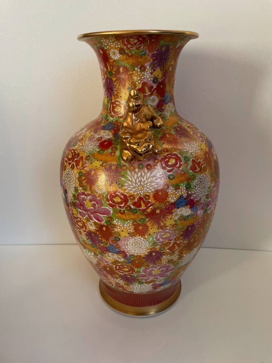 【和美】高さ46.2㎝ 九谷焼 光峰 錦彩花尽獅子耳付 大花瓶 本物保証 花瓶 壺 大壺 花器 15