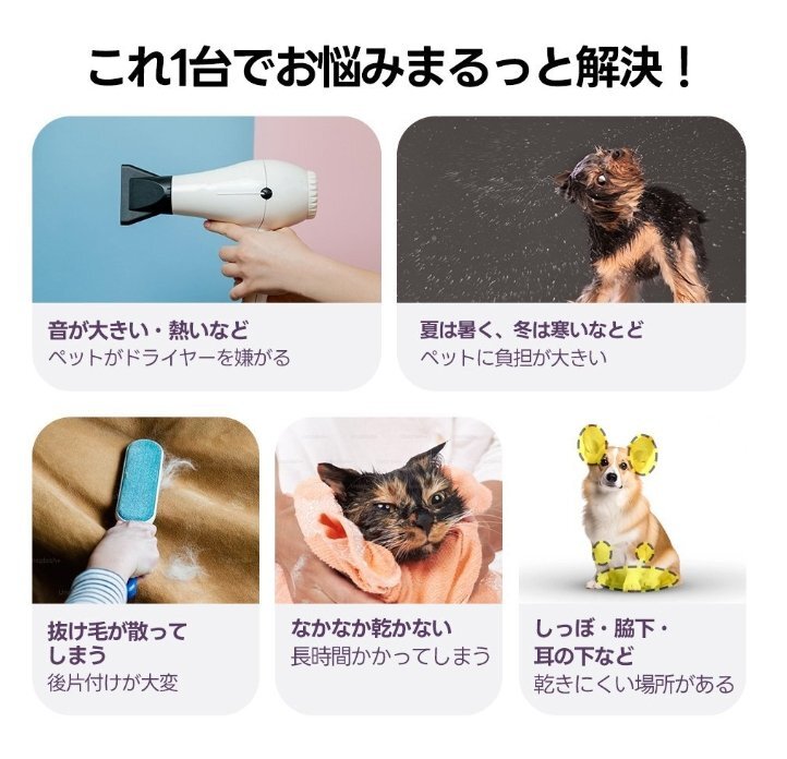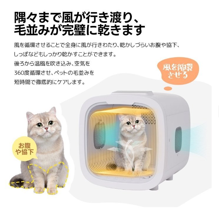 ◆03お部屋みたいにくつろげる 長方形の小さなお部屋のような形状で、ペットは中で自由自在に遊び、くつろいでいるあいだに乾きます。 まずは風を使わず、お部屋に慣れてもらうところからスタート♪ 隅々まで風が行き渡り、毛並みが完璧に乾きます 風を循環させることで全身に風が行きわたり、乾かしづらいお腹や協下、しっぽなどもしっかり乾かすことができます。後ろから温風を吹き込み、空気を360度循環させ、ペットの毛並みを短時間で徹底的にケアします。 ペットに優しい、静かな運転音 騒音はわずか80デシベル、「人が小声でしゃべる」ぐらいの音量でペットが怖がらずに乾燥できます! 静かで臆病なペットや音に敏感なペットにも、安心して使用できます。 内部ライトで、いつでも中の様子が確認可能。 内部ライトが暗い場所でも明るく状態を確認できます。いつでもペットの安全を確保できます。