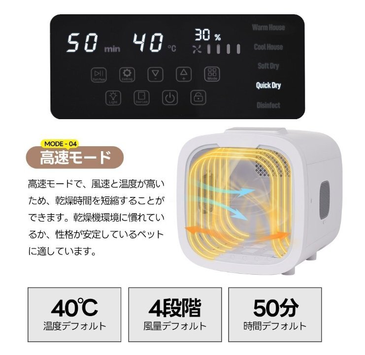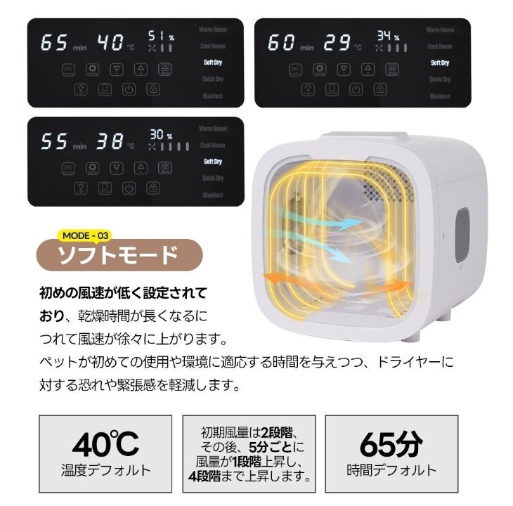 ◆015種類モードがえらべて、様々な状況が対応できる ウォームモード 寒い日には、暖かい風がペットの体全体をやさしく包み込み、ペットの毛を優しく吹き、ムラなく乾かします。ペットにとって心地よい体験を提供し、冬季のケアに最適です。 温度デフォルト:30℃ 風量デフォルト:3段階 時間デフォルト:99分 クールモード 温風だけでなく冷風へ切り替えることも可能なので、暑い日には冷風を混ぜながら乾かしてあげることができます。暑い季節にペットの体を冷やして、熱中症の予防になります。 温度:室温 風量デフォルト:1段階 時間デフォルト:99分 ソフトモード 初めの風速が低く設定されており、乾燥時間が長くなるにつれて風速が徐々に上がります。ペットが初めての使用や環境に適応する時間を与えつつ、ドライヤーに対する恐れや緊張感を軽減します。 温度デフォルト:40℃ 初期風量は2段階、その後、5分ごとに風量が1段階上昇し、4段階まで上昇します。 時間デフォルト:65分 高速モード 高速モードで、風速と温度が高いため、乾燥時間を短縮することができます。乾燥機環境に慣れているか、性格が安定しているペットに適しています。 温度デフォルト:40℃ 風量デフォルト:4段階 時間デフォルト:50分 殺菌モード オゾンの優れた殺菌力・脱臭力は細菌・雑菌・カビ菌も短時間で死滅させて、効率よく消臭できます。飼い主とペットの健康を守って、一緒に快適な生活を送りましょう。 ※温度:40℃風量:2段階 時間デフォルト:20分 このモードを開始する際は、ペットが乾燥機に 入らないように注意してください。